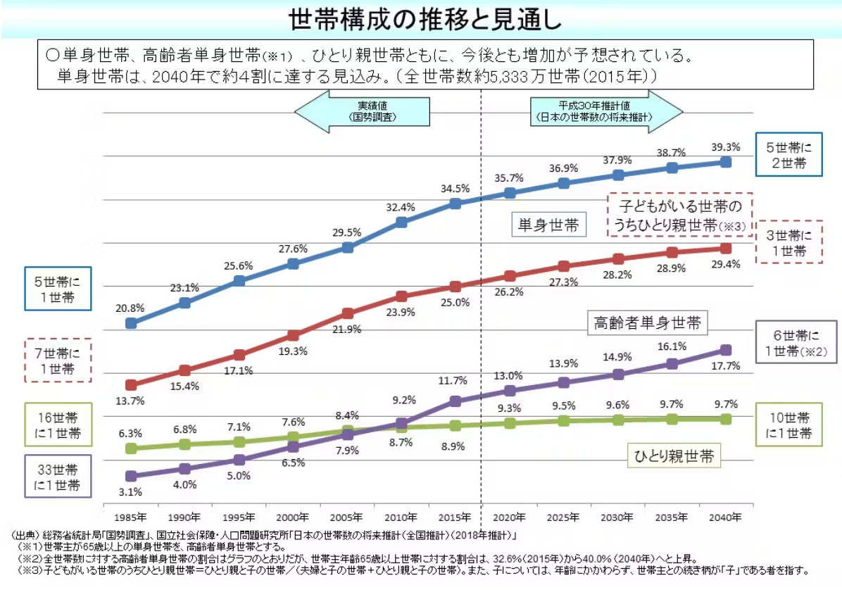 2019年国民生活基礎調査によると日本の高齢者の単独世帯率は17.7%となっており、2040年には4割に達すると試算されています。