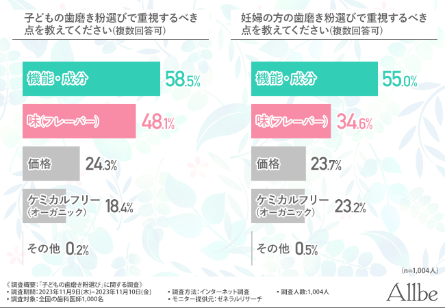 「子どもの歯磨き粉選びで重視するべき点を教えてください(複数回答可)」と質問したところ、『機能・成分(58.5%)』と回答した方が最も多く、次いで『味(フレーバー)(48.1%)』と続きました。