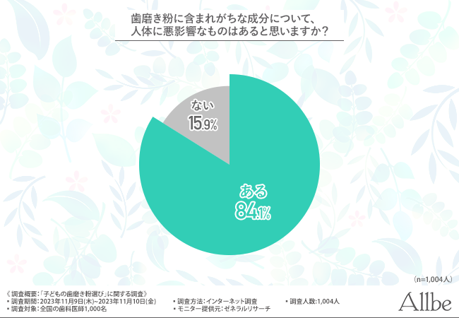 「歯磨き粉に含まれがちな成分について、人体に悪影響なものはあると思いますか」と質問したところ、8割以上の方が『ある(84.1%)』と回答しました。
