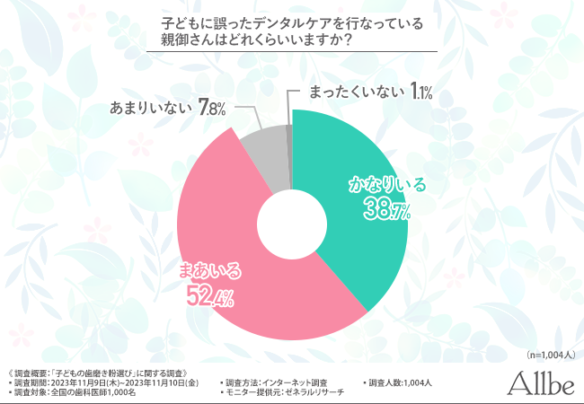今回の調査では、約4割の歯科医師が「子どもに誤ったデンタルケアをしてる親はかなりいる」と考えていることから、子どものためにデンタルケアの方法を見直す必要性が示唆されました。