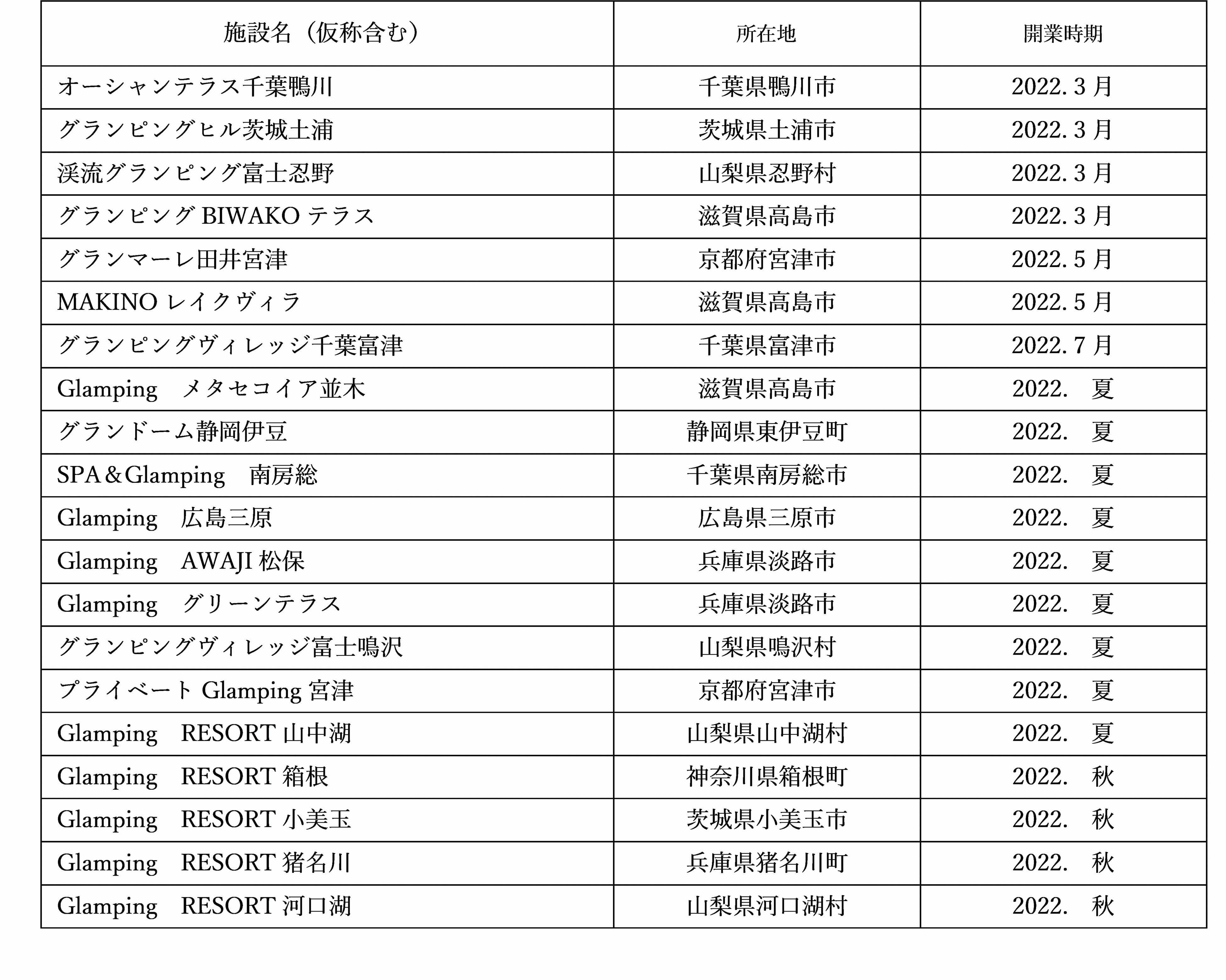 グランピング業界大手の㈱にしがきマリントピアリゾートグループは、2022年中に20施設の開業を計画しているなど、先行事業者による2施設目以降の展開も目立っています。