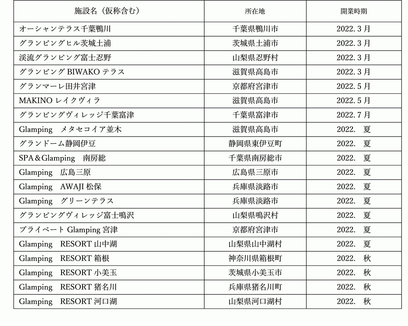 【㈱にしがきグループの2022年グランピング開業計画一覧】