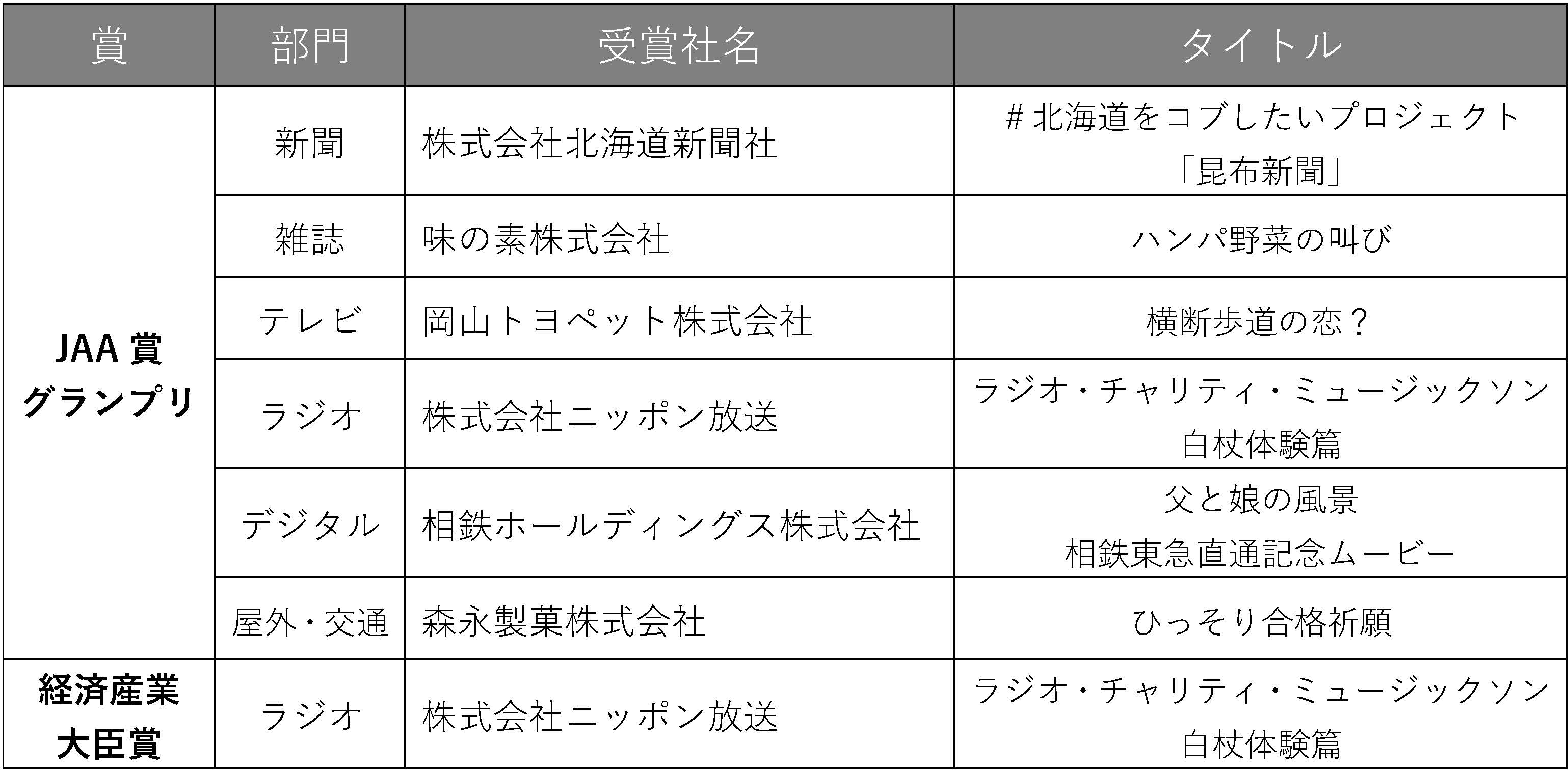 ※「JAA賞グランプリ ラジオ広告部門」と「経済産業大臣賞」を受賞した「株式会社ニッポン放送/ラジオ・チャリティ・ミュージックソン 白杖体験篇」は同一作品での受賞となります。