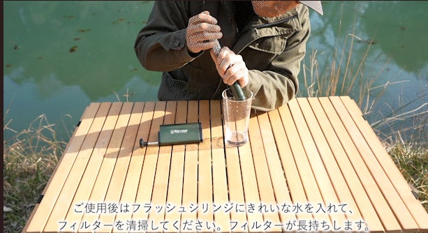 そのような時にも、雨水や湖の水など自然水源から水を採取し、本ポータブル浄水器を用いることによって水を飲めるレベルまでキレイにし、飲み水を確保することが可能になります。