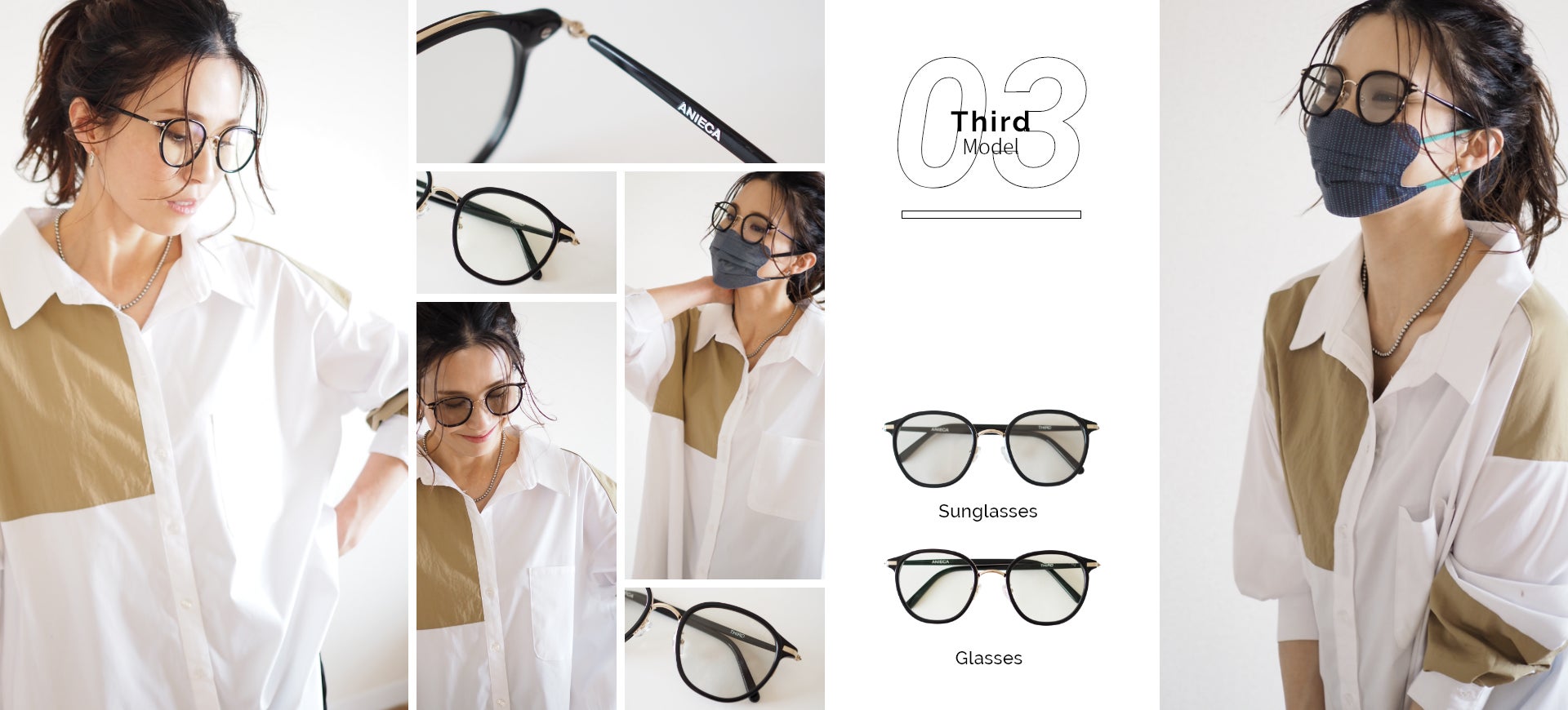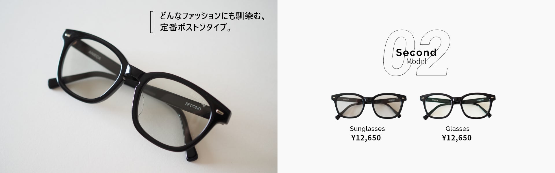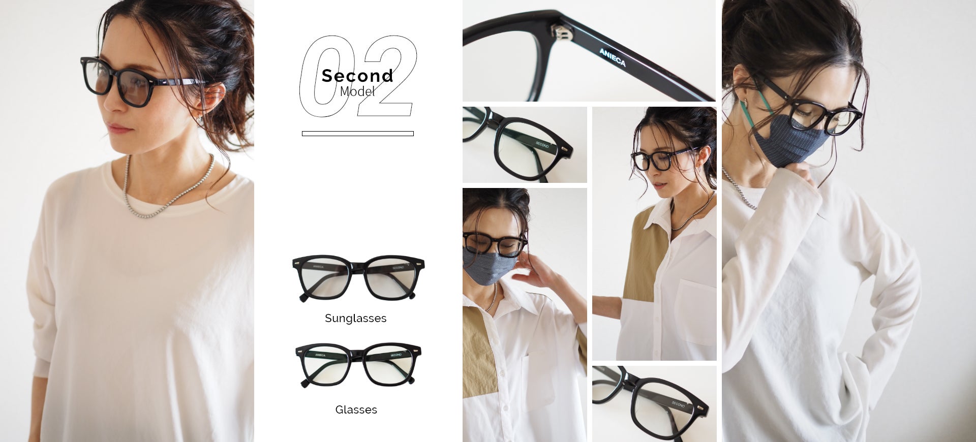 First Modelのラインを踏襲し、ファッションへのあわせやすさにこだわったのがボストンタイプのSecond Model。ファットなフレームはANIECAの世界観にもマッチング。小顔効果がさりげなくこれからの季節の装いに彩りを添えてくれます。ボーイズライクなファッションにも馴染む定番のアイウェアです。