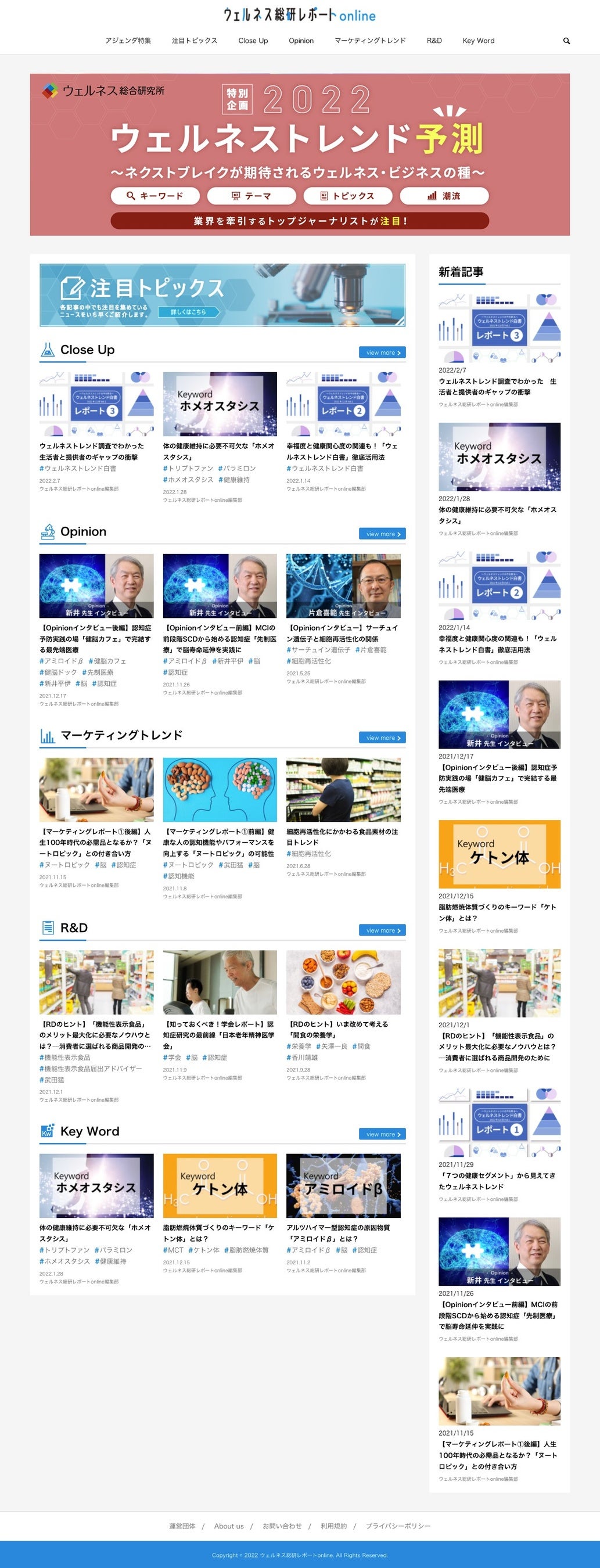 新コーナー新設に加えて、ポストアンチエイジングの潮流として注目される「細胞再活性化」をテーマにした特集、ウェルネス総研発行の調査レポート「ウェルネストレンド白書」をきっかけに展開している生活者の健康セグメントを独自視点で分析、レポートする「ウェルネストレンド白書」コーナー、研究者、医療従事者、食のエキスパートなど専門家のインタビューをレポートする「Opinion」、ウェルネス領域の市場動向や国内外のトレンドを解説する「マーケティングトレンド」、商品や研究開発に役立つヒントを発信する「R&D」、知っておくべきウェルネス用語を解説する「Key Word」などのコーナーなど、ウェルネスに関わる最新情報を公開しています。