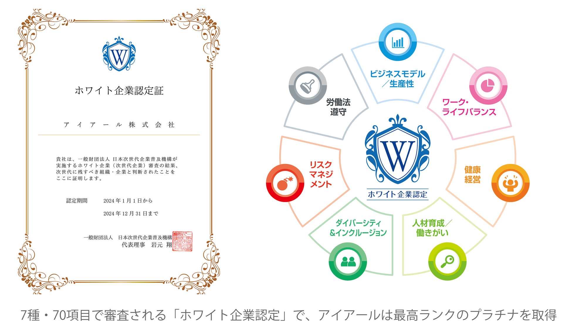 この認定は「人材育成/働きがい」「柔軟な働き方」「労働法遵守」などの7分類・70項目の審査を通じて評価されるもので、アイアールは5段階評価の最高ランクであるプラチナの認定を受けています(写真)。