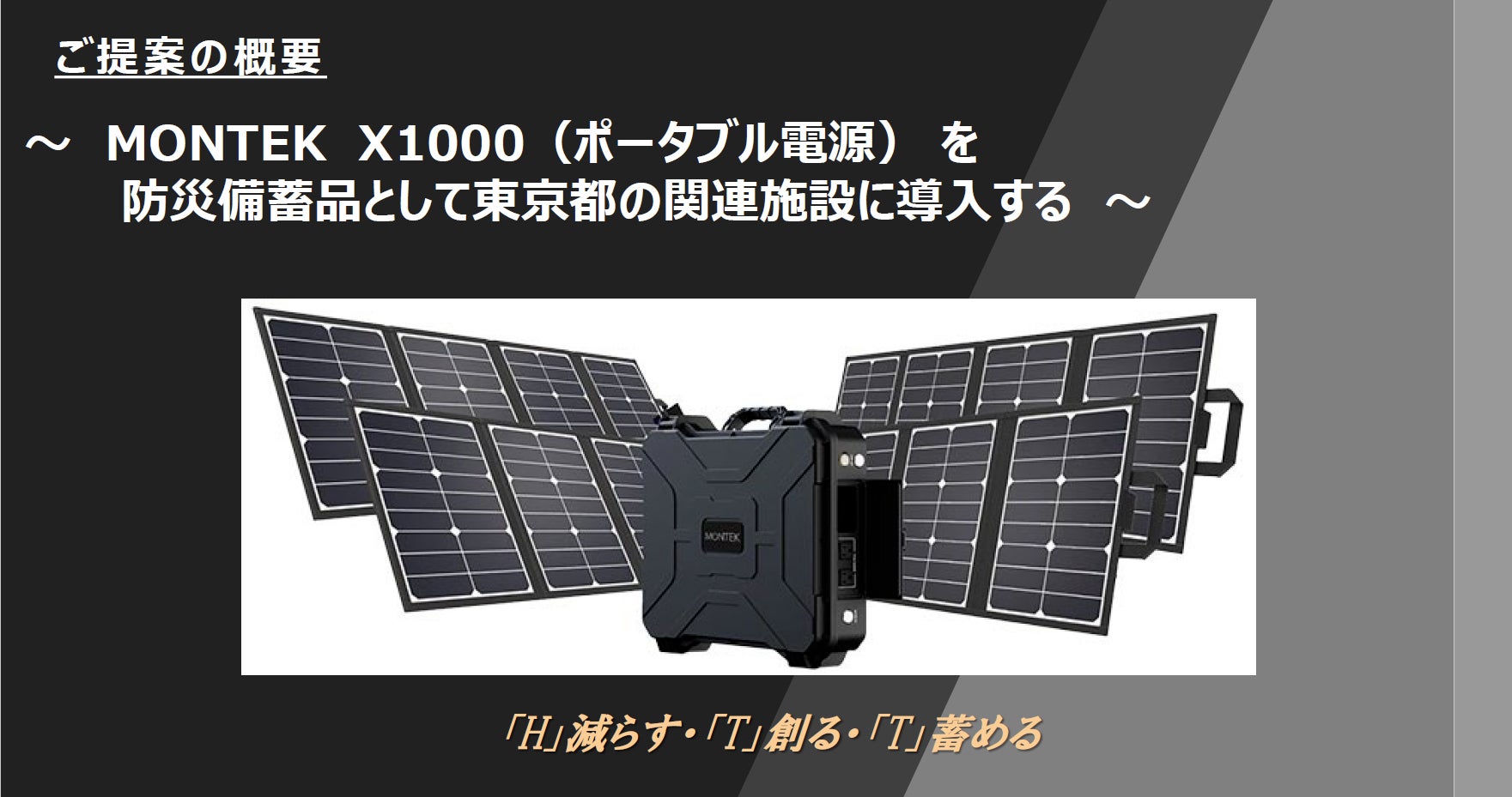 そのイベントで東京都のご担当者様に都の施設にMONTEK X1000 を防災備蓄品として導入していただくようご提案いたしました。
