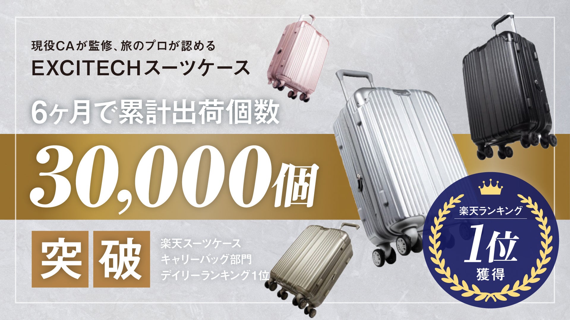 「本当に必要とされる商品を世界に流通させる」という理念のもと、数多くのベストセラー商品を世に送り出してきた株式会社Extage(大阪市中央区、代表取締役社長:野口拳大、以下「Extage」)は、当社が手がけるブランド「EXCITECH(エキサイテック)」のスーツケースが発売から6ヶ月で累計出荷個数3万個を突破し、さらに楽天ランキング(スーツケース・キャリーバッグ部門)において1位を獲得したことをお知らせいたします(2024年12月9日時点)。