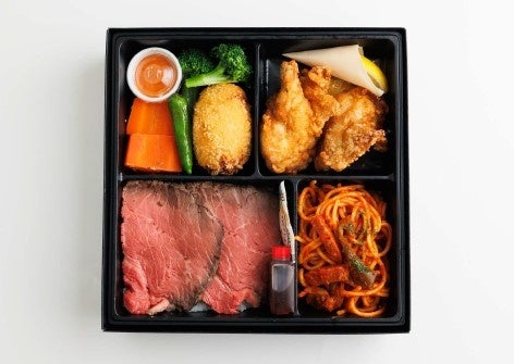 唐揚げ、蟹クリームコロッケ、ナポリタン、ごはんにはローストビーフをのせて。長年にわたり多くのお客様から愛されてきた伝統の味を一折に。三笠会館の想いが込められたお弁当です。