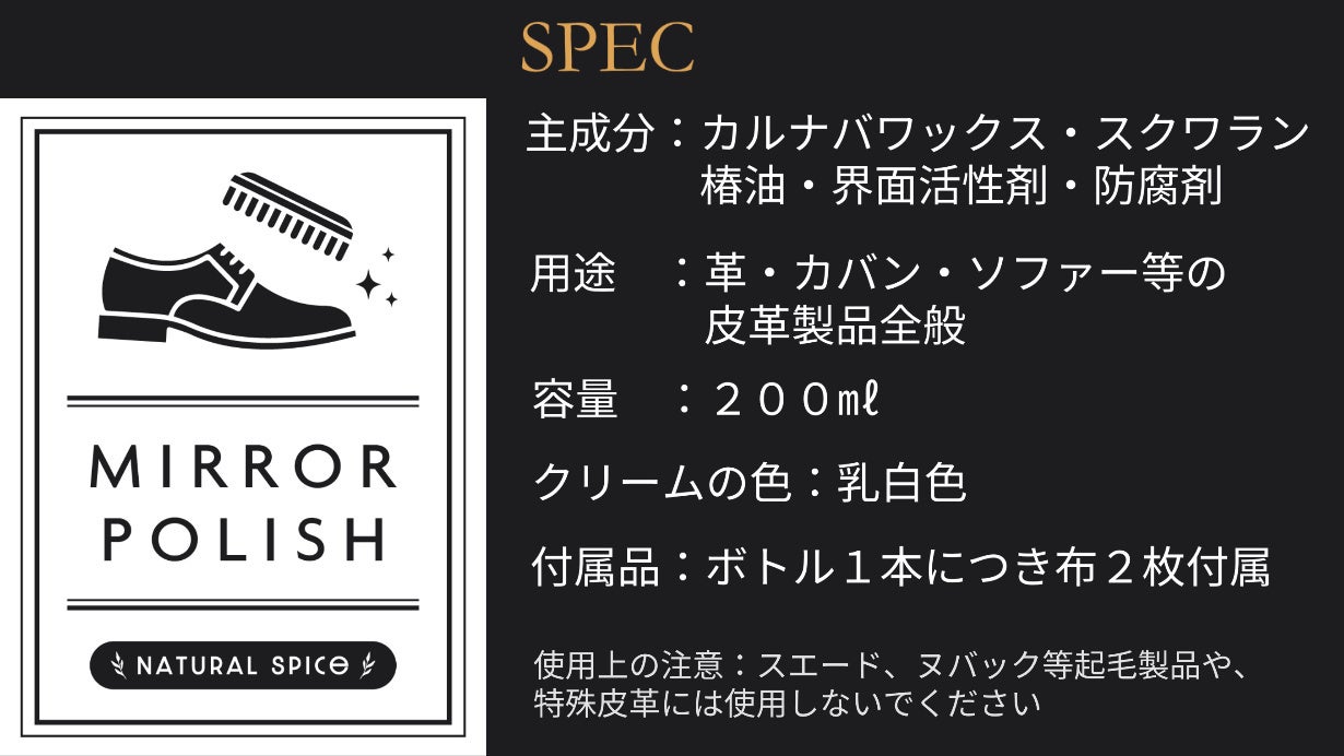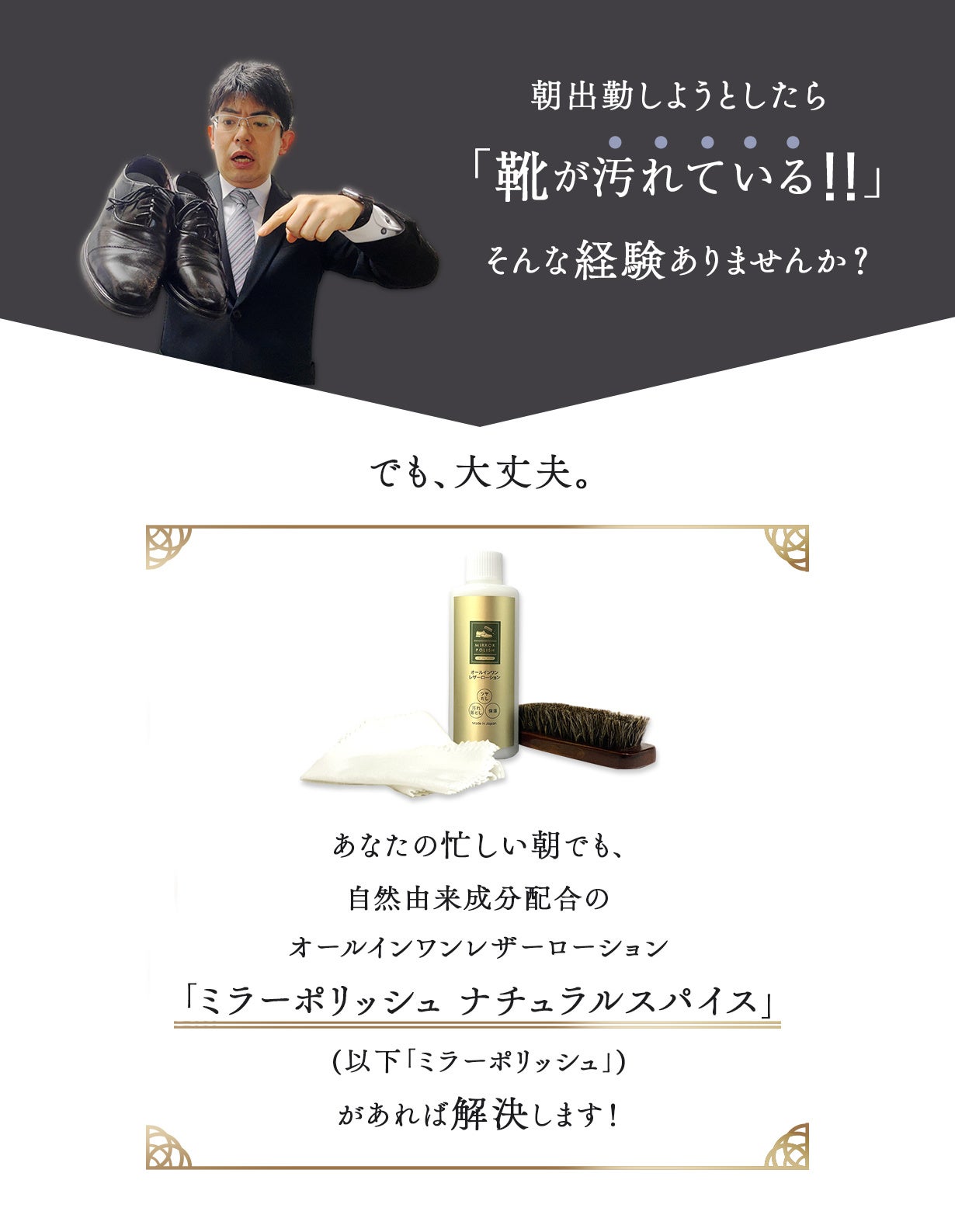 今回、有限会社ダヴィンチクリエイトが販売する「ミラーポリッシュナチュラルスパイス」は、朝の忙しい時間帯でも短時間で靴磨きを完了できるよう、革靴の艶出し・汚れ落とし・保湿の機能をたった1本で持ち合わせており、さらに、ユーザーの要望の強い艶出し効果を通常商品よりアップさせた、革専用のクリームとなっております。