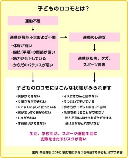 「ロコモティブシンドローム(以下「ロコモ」という)」という言葉をご存知でしょうか?日本語でいうと「運動器症候群」、つまり骨や関節の機能が低下し、基本的な運動能力が衰えている状態を指します。高齢者には耳慣れた言葉かもしれませんが、実は近年、子どもたちにもこのロコモが起きているといわれています。運動不足による運動器機能の不全/不調だけではなく、特定のスポーツに偏った運動過剰による運動器疾患やケガ、スポーツ障害からもいわゆるロコモ状態となり、運動だけでなく日常生活、学校生活にも支障をきたしています。