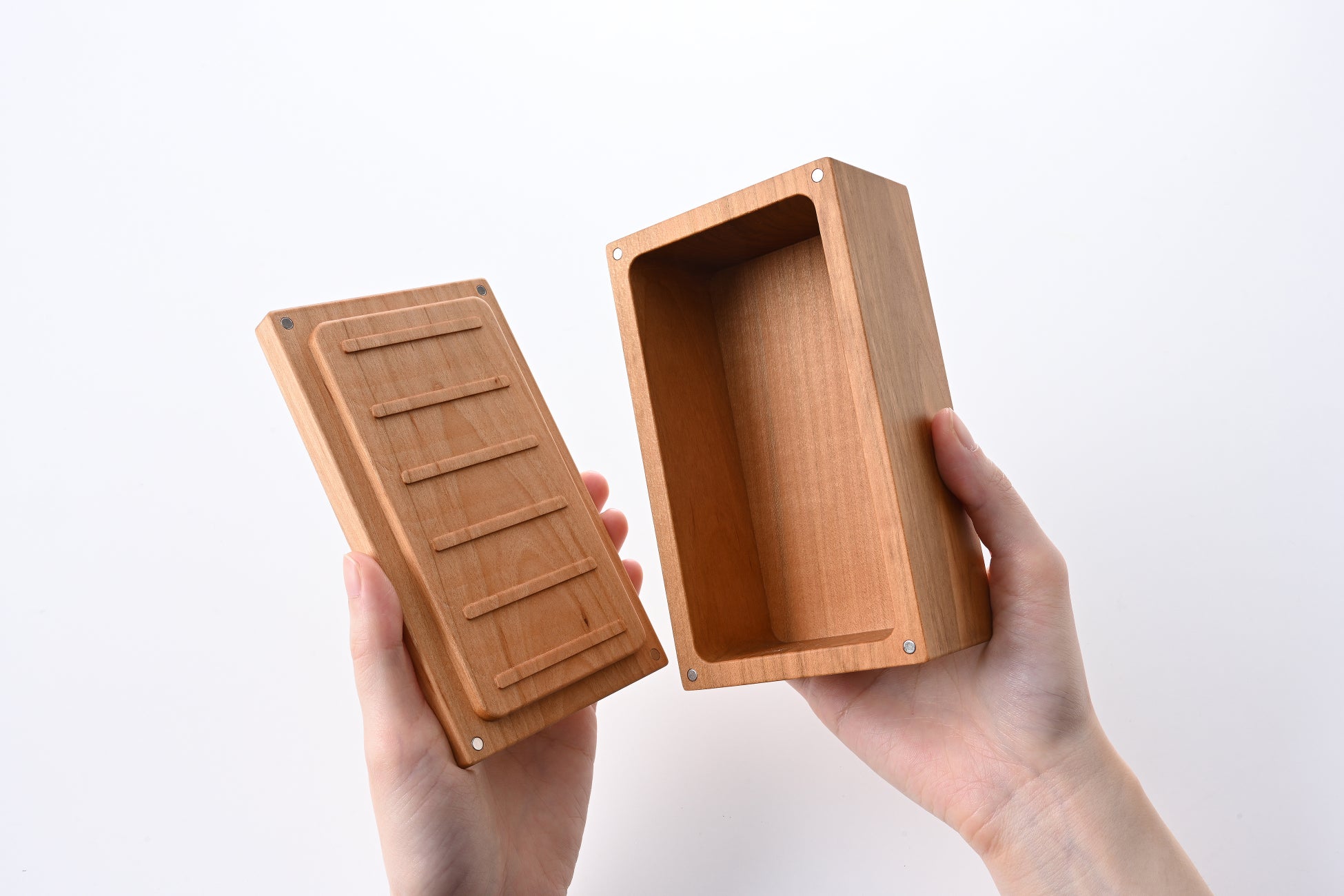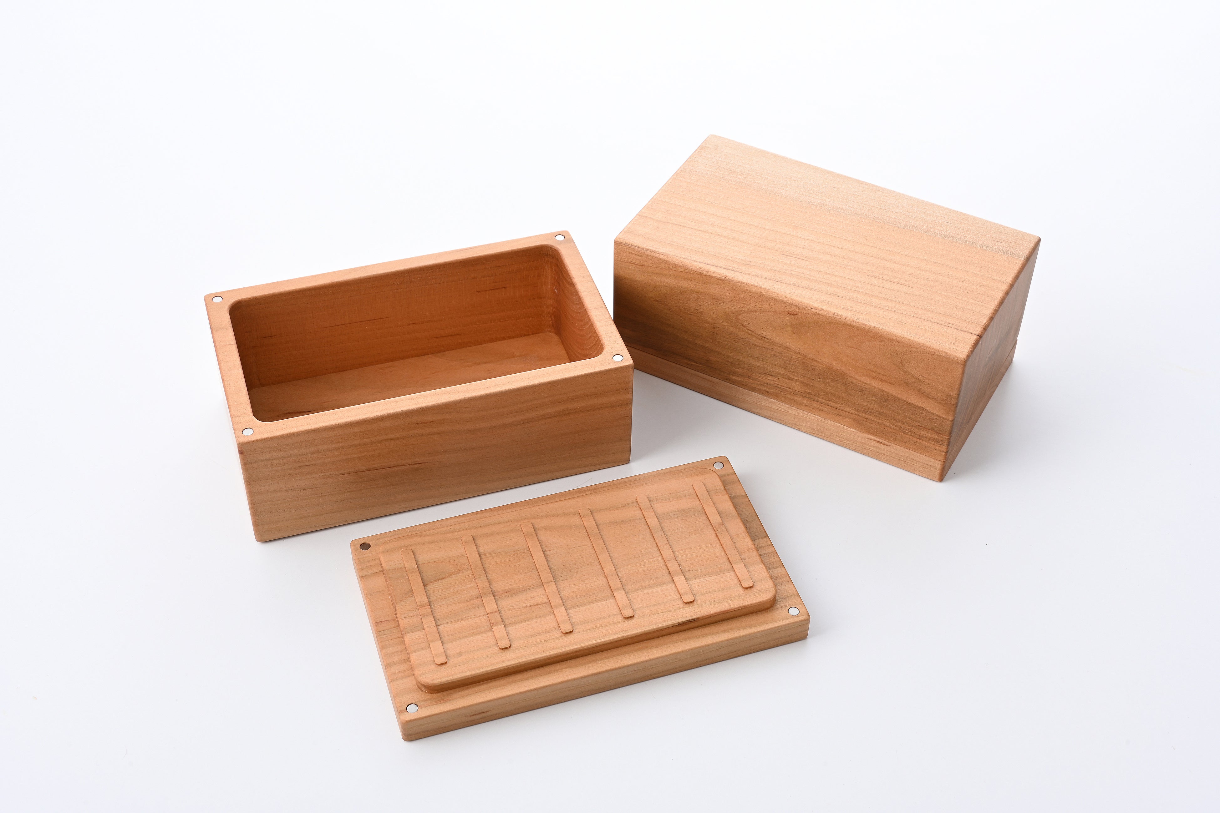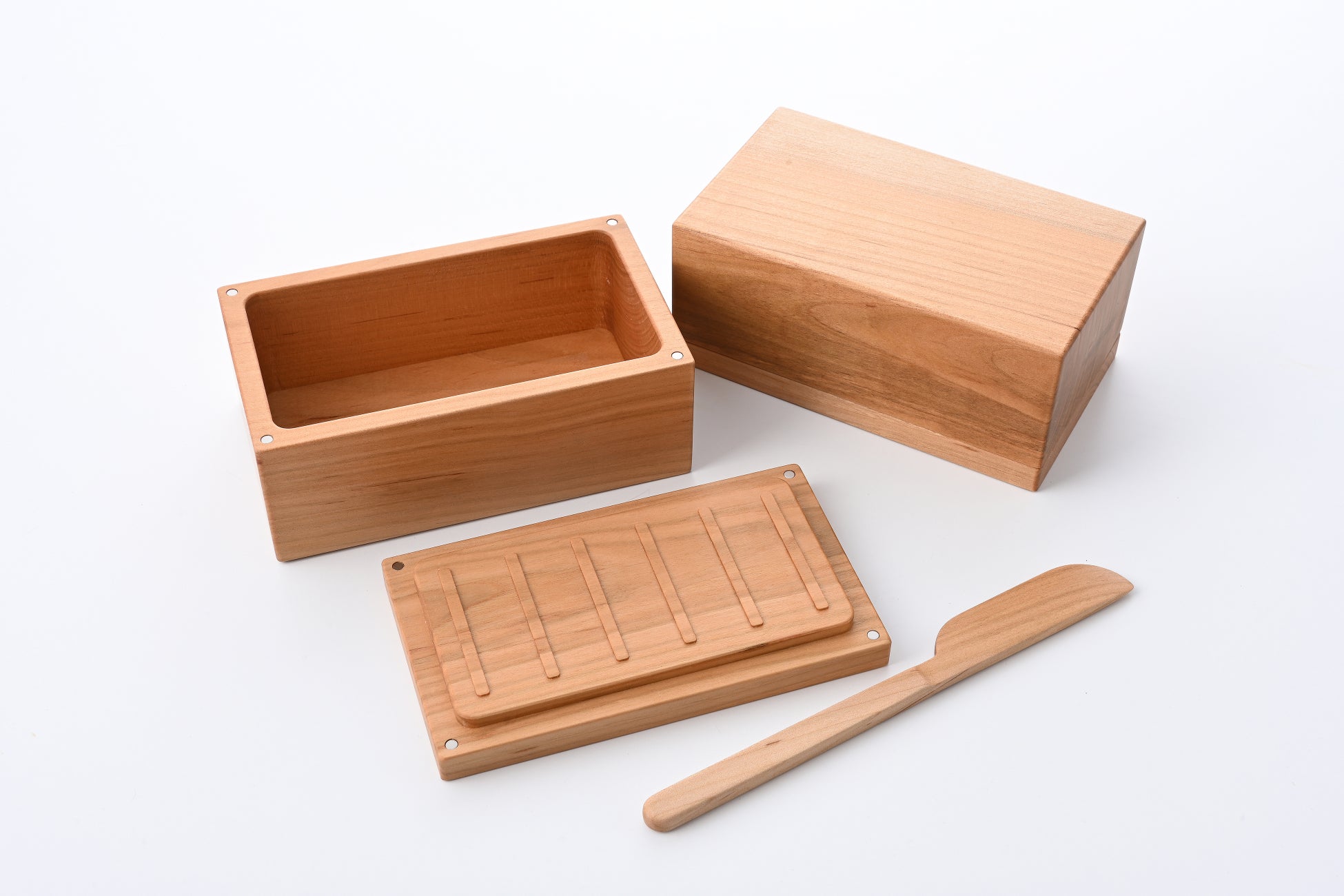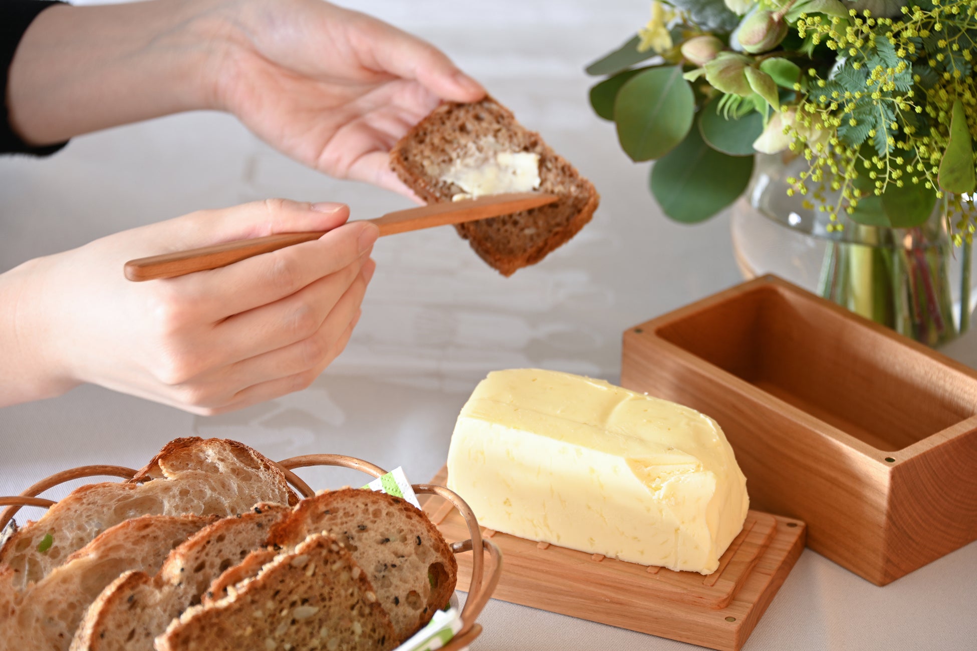 バターケースの特徴は、無垢の木材の断熱性と密閉構造によりバターの品質を保つ機能性、さらに、毎日の食卓で使いたくなる、柔らかな木のぬくもりとデザイン性です。バターナイフは、滑らかな握り心地と切れ味で、木でありながらストレスなくバターを切れるよう設計されております。バターケース、バターナイフどちらも、本体の素材には中国地方の山桜を使用しております。いつもの食卓をより特別にお楽しみ頂けるアイテムです。
