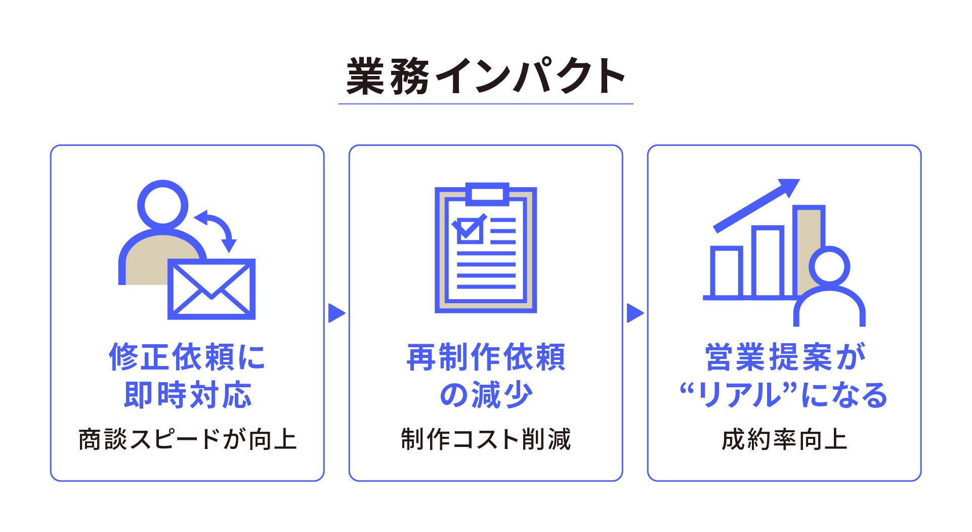顧客の細かい要望にも即日対応が可能になり、初期提案後も「提案→修正→再提案」がワンストップで完結します。より具体的な顧客に寄り添う提案力を、コストを抑えてスピーディーに実現することで、成約率の向上につながります。