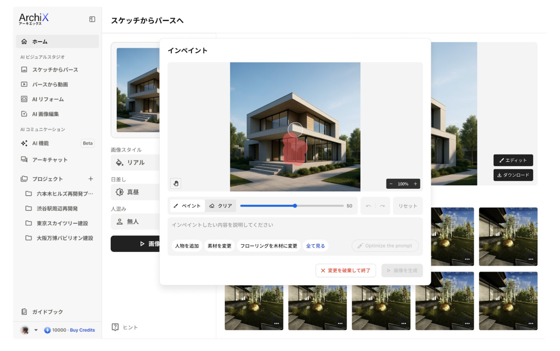 アーキエックスで生成したパースの修正したい画像の特定のエリアをブラシで選択し、プロンプトで指示するだけで、画像の一部を置き換えたり修正することができる機能です。