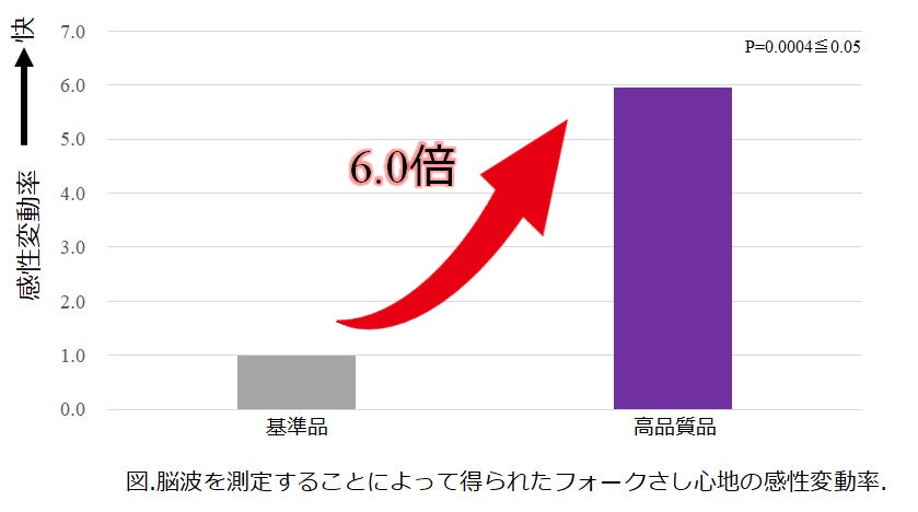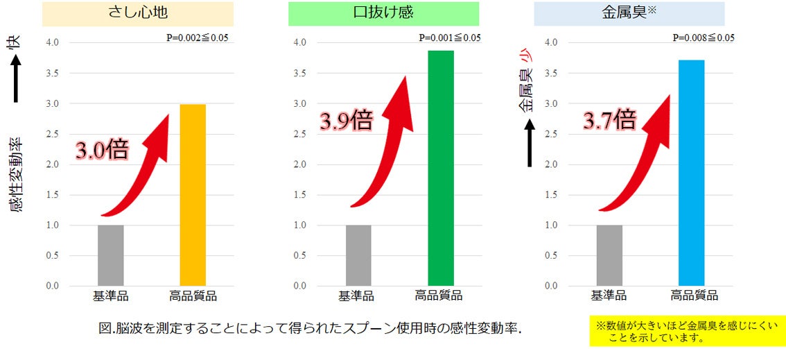 その結果、被験者20名に対し一般的な麻布と絹布との心地良さでは絹布の方が2.3倍心地良いという実験結果が出た中、山崎製品品質と普及品品質のスプーンにおけるさし心地の良さでは3.0倍、口抜け感の良さで3.9倍、金属臭の少なさで3.7倍、フォークにおけるさし心地の良さでは6.0倍の違いがありました。