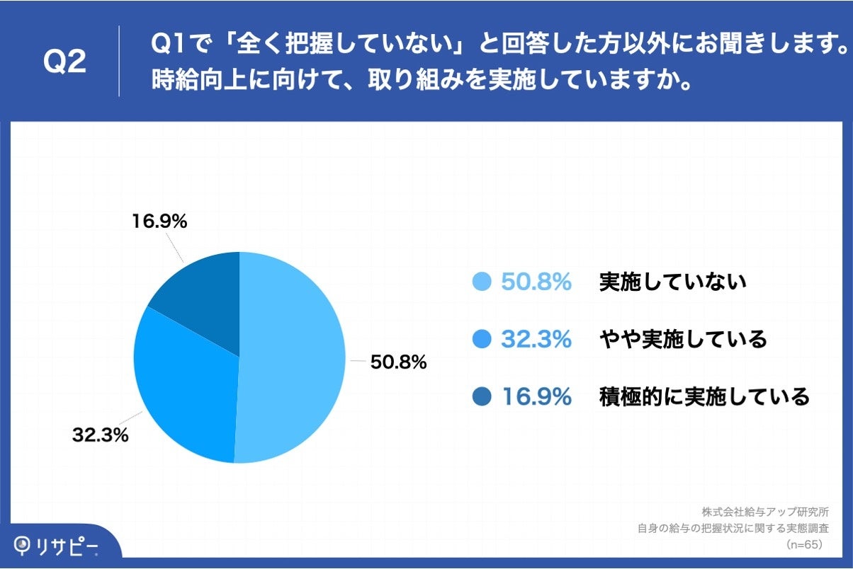 実際に、時給を正確に把握しているかに関して総合職相当で10年目以上の会社員にアンケート(※1)を取ると、時給を100円単位以上で回答できる会社員は24%でした。また、時給向上への具体的な取り組みの有無について聞くと、取り組みを行なっている会社員は半数程度にとどまっています。