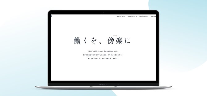 本質の追求を表現できるよう、TOPページはVisionである「働くを、傍楽に」を前面に押し出したシンプルなデザインにしました。また、「傍(はた)を楽(らく)にする」というキーワードが持つ柔らかく温かみがあるイメージを暖色の背景色や丸みのあるフォントで表現しています。