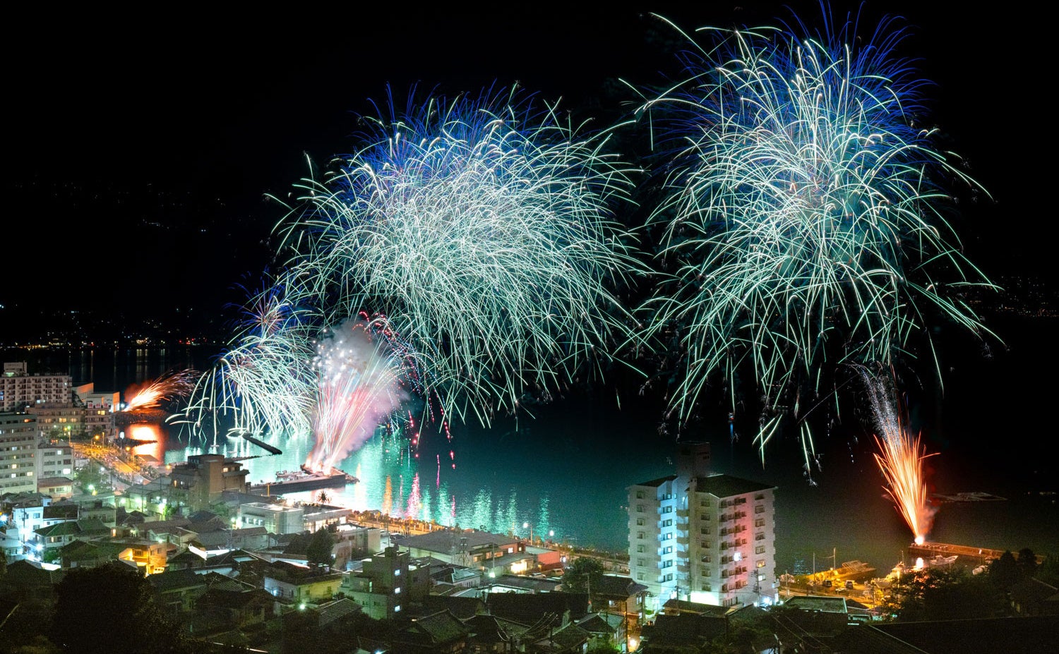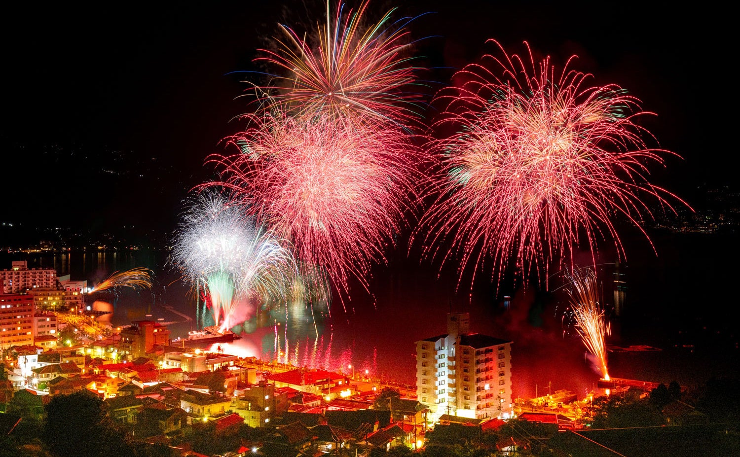 毎年8月16日に網代温泉で開催される海上花火大会。国道135号沿いの網代湾から多賀湾にかけて、約3000発の花火や灯篭流し、百八体焼きの旧盆送り火の行事が行われる。網代湾の花火と、多賀湾での灯篭流しの灯りや送り火があいまって、壮観な情景が楽しめる。海上から斜めに打上げる「海上横打ちスターマイン」や空中ナイアガラ、網代ならではの魚をかたどった花火などもあり、見どころは尽きない。
