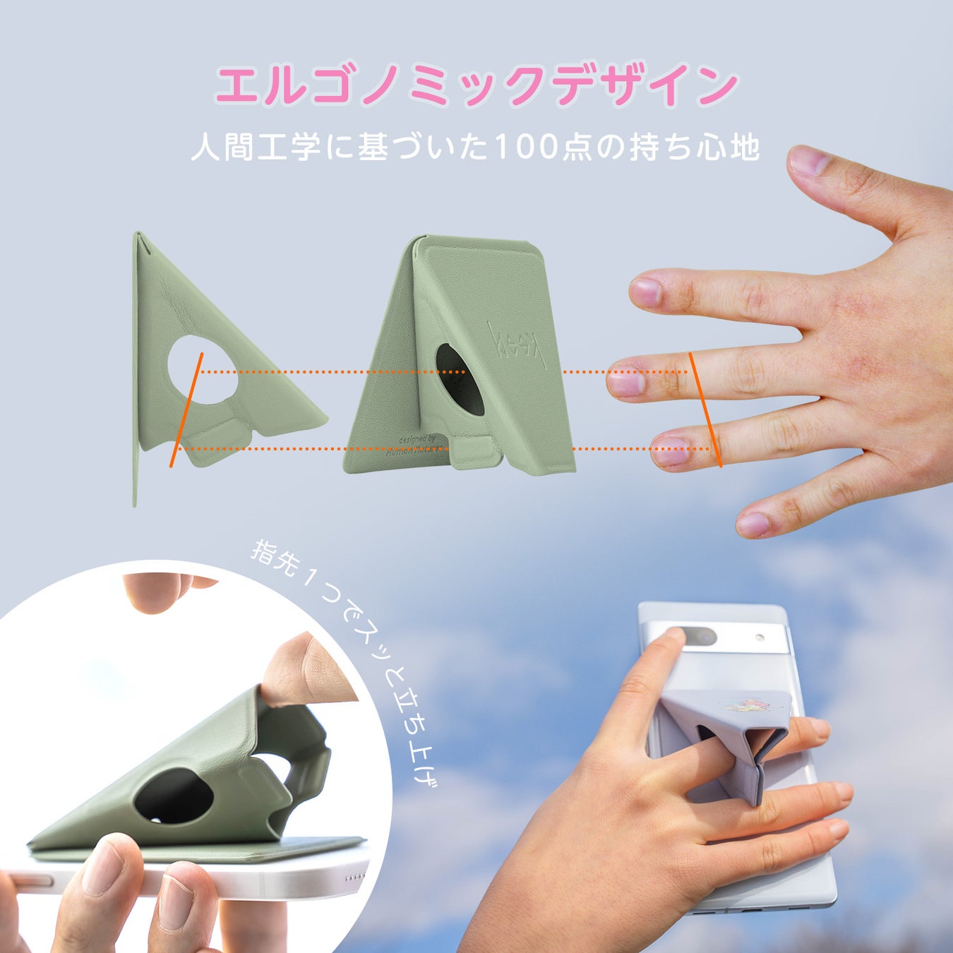 折りたたまれた平らな状態から瞬時(0.5秒)にグリップスタンドの形状に変形できます。(特許取得済)