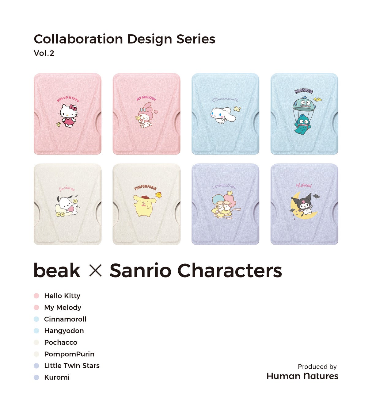 Human Natures(運営:有本開発株式会社 [本社:京都市南区、代表取締役:有本 匡志])は、 2024年6月16日9時よりスマートフォン用グリップスタンド beak [ビーク] に株式会社サンリオのキャラクター全8種(ハローキティ、マイメロディ、シナモロール、ハンギョ ドン、ポチャッコ、ポムポムプリン、リトルツインスターズ、クロミ)とコラボレーションしたデザインの商品を販売いたします。