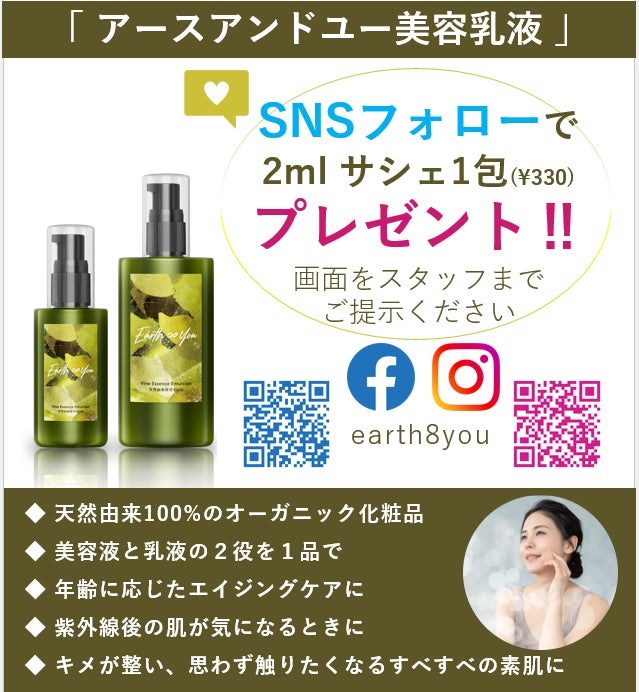 名古屋タカシマヤのイベント会場内ブースにて、アースアンドユーSNS(Facebook、Instagram)を初めてフォローいただいた方に、お試し用のサシェ2mL(1包330円相当)をプレゼント。「アースアンドユー」ブースのスタッフにフォロー画面をご提示ください。プレゼントの数に限りがあり先着順となります。