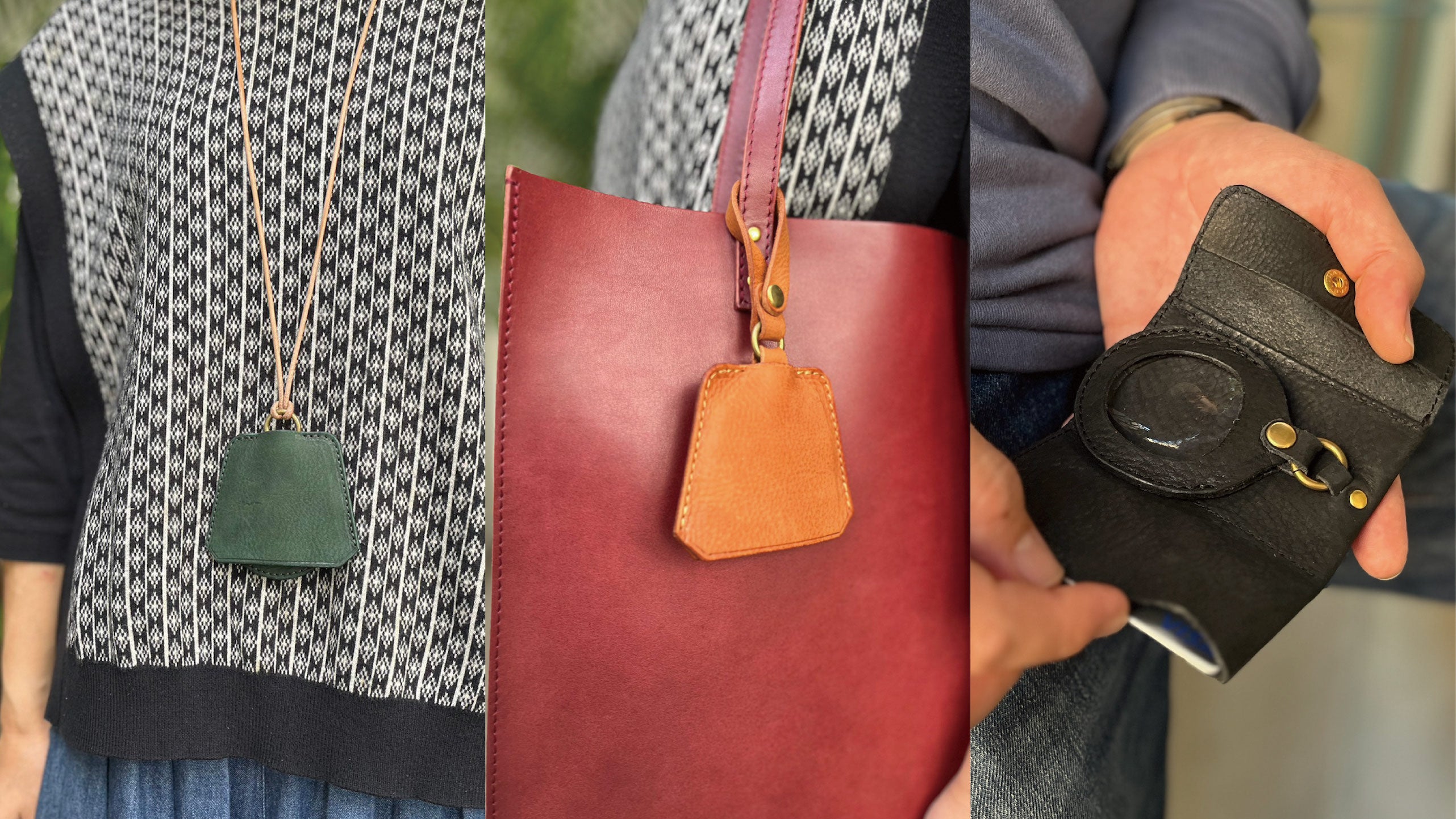 持ち運び方は3種類。首からかけたり、カバンの持ち手、コイン&パスケースにも付けられ、ルーペの持ち運び方はあなたのスタイルに合わせて変えられます。