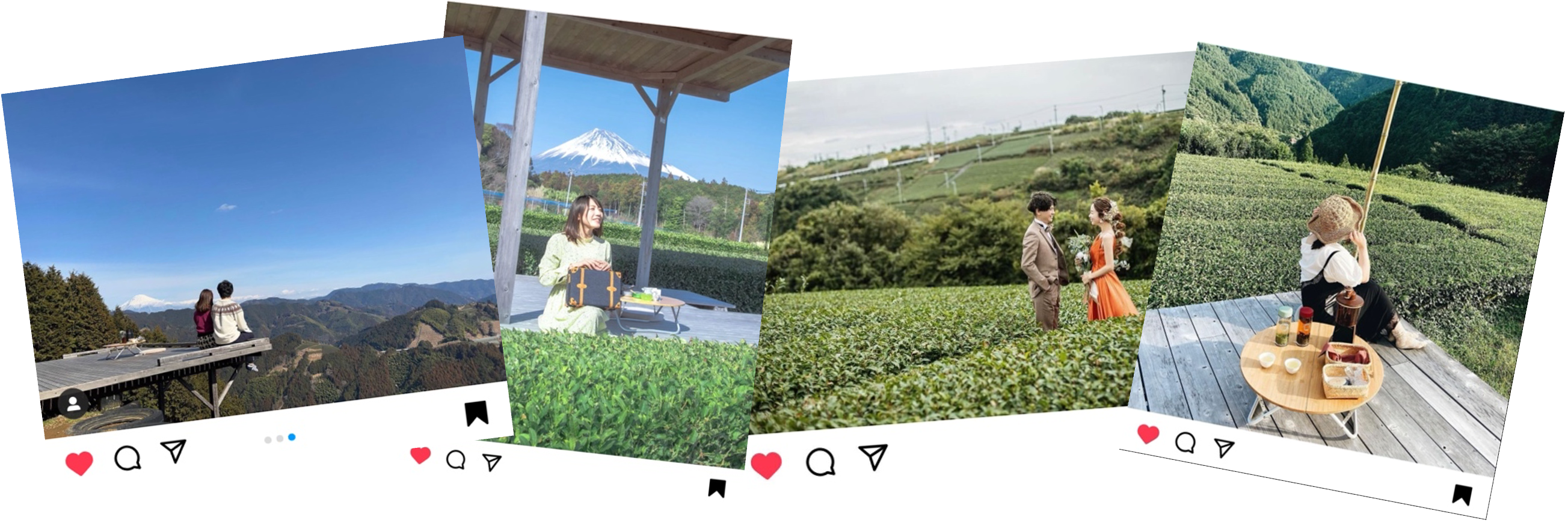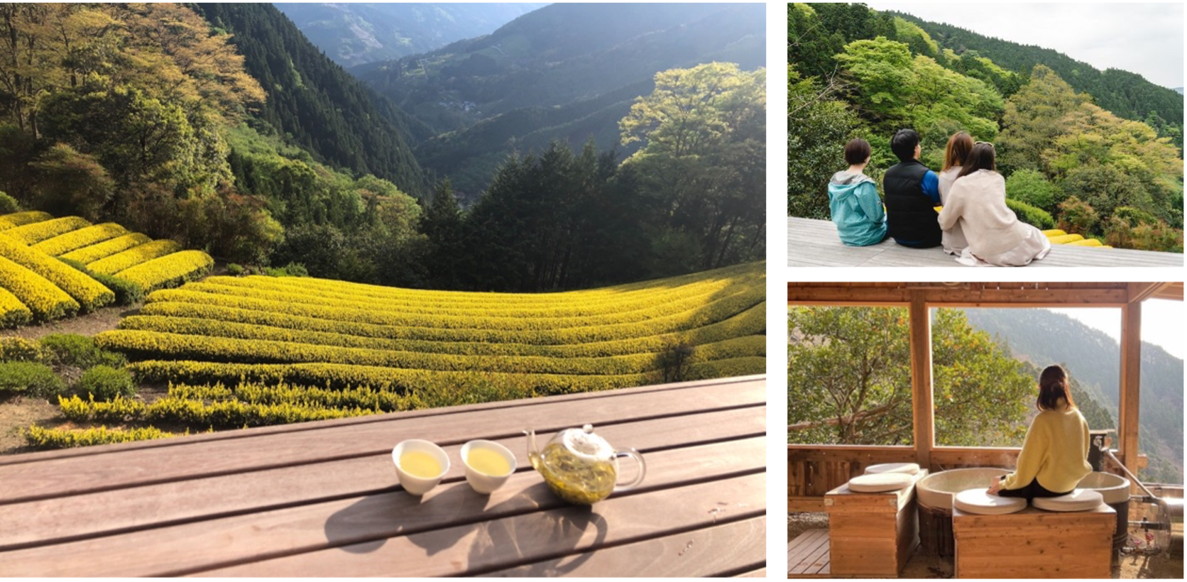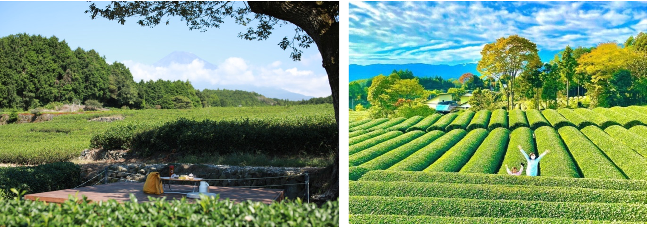 2019年よりサービスを展開し好評を博している「茶の間」。静岡県7箇所ある茶の間は、完全貸切、事前予約制。地元の茶農家の方にご協力いただき、茶畑の中にテラスを設置。茶畑と茶の間から見える景観を楽しみながら、その地で採れたお茶を味わう、茶産地でしかできない体験です。