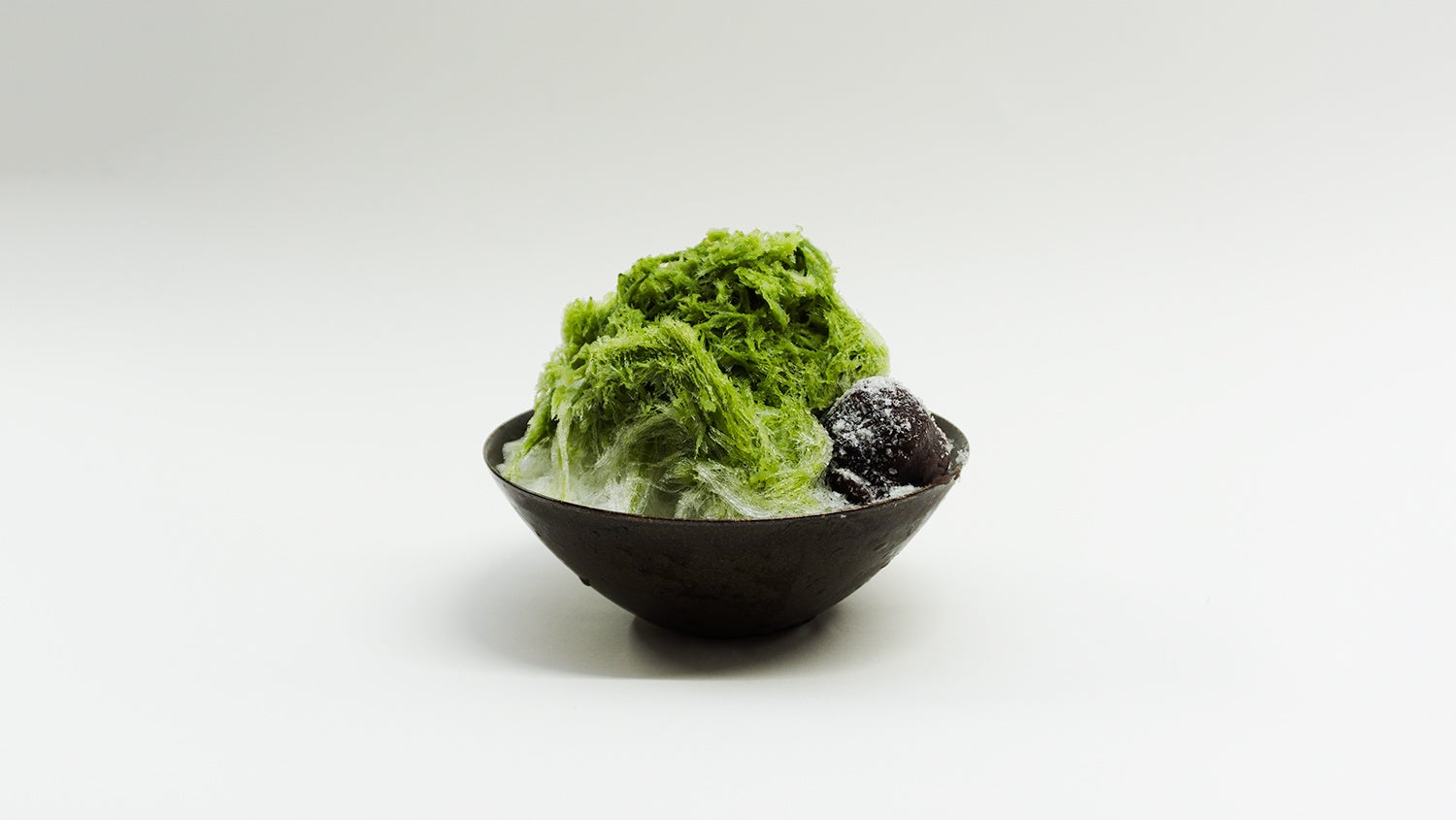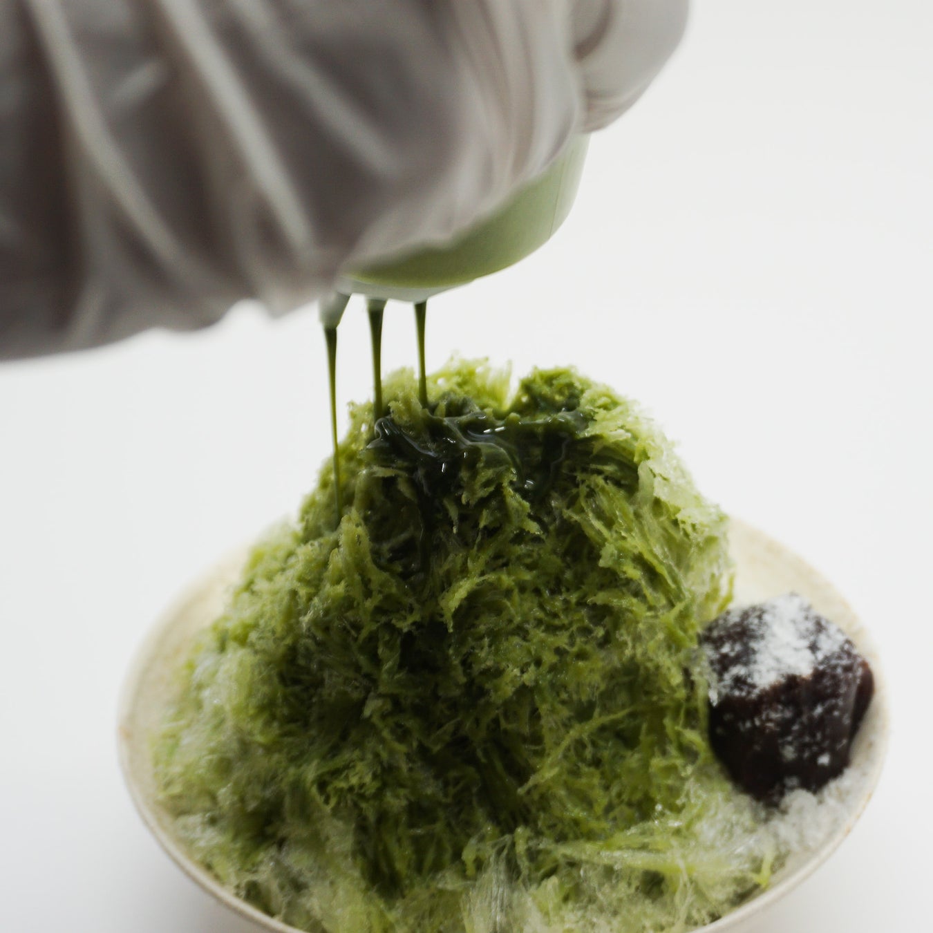 なめらかな口あたりが特徴の玉澤謹製あんこ餅に独自開発の霜塩を添えた「霜塩小餅」を器にあしらい、ふわりと柔らかい口溶けの氷と玉澤オリジナル抹茶ソースを二層に重ねました。