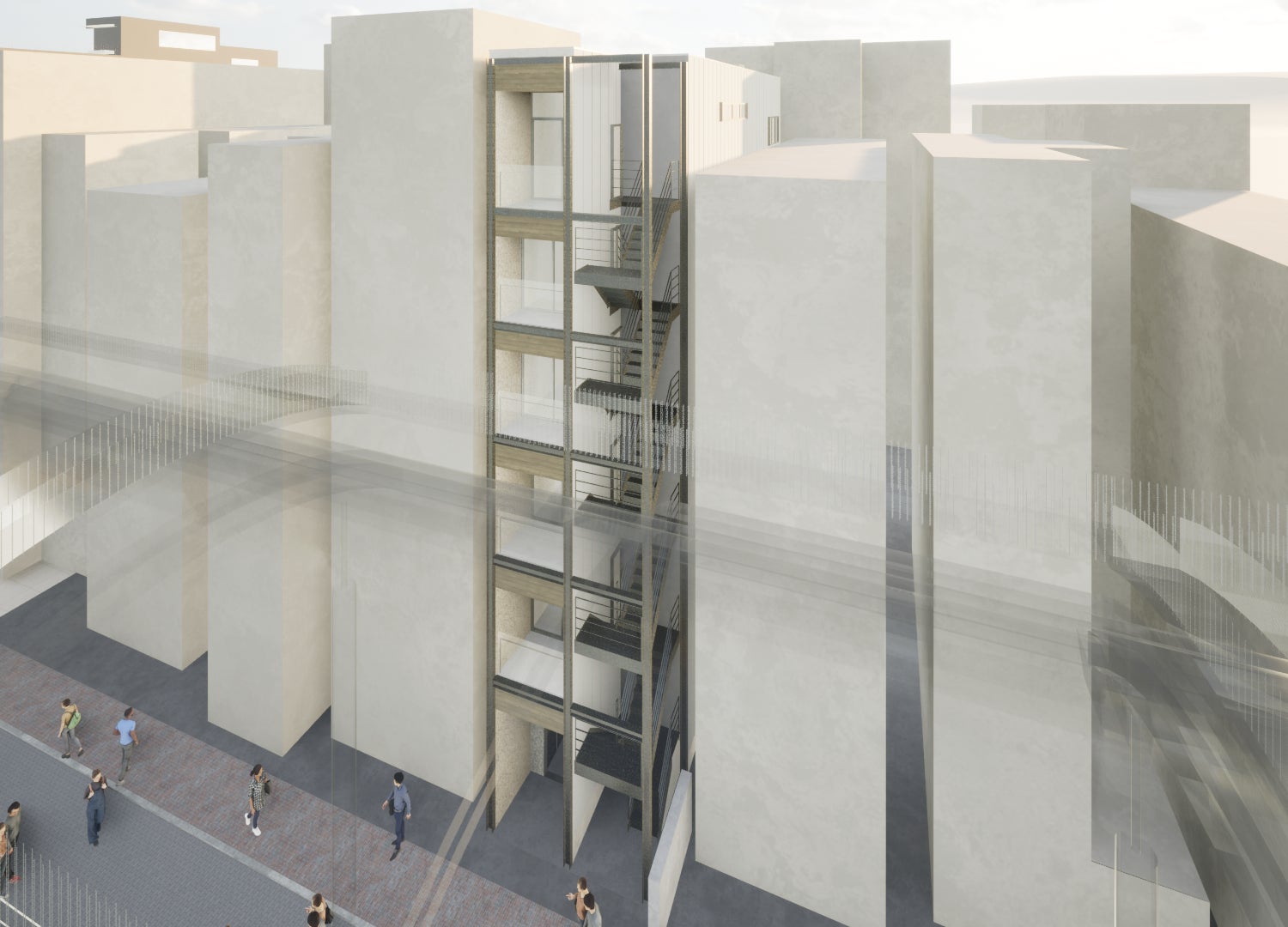 そこで、本建物はアーケードとの敷地境界から建物を1m余セットバックし、更に屋外階段とバルコニーをアーケード側に開放するような立面としてデザインすることで、それらの境界を和らげるとともに、奥の深い平面に対して外部の環境を可能な限り取り込むことを目的としている。(設計事務所 abanba より)