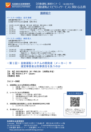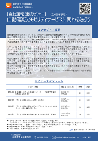 松田綜合法律事務所は、「自動運転とモビリティサービスに関わる法務」と題して、連続WEBセミナーを開催します。