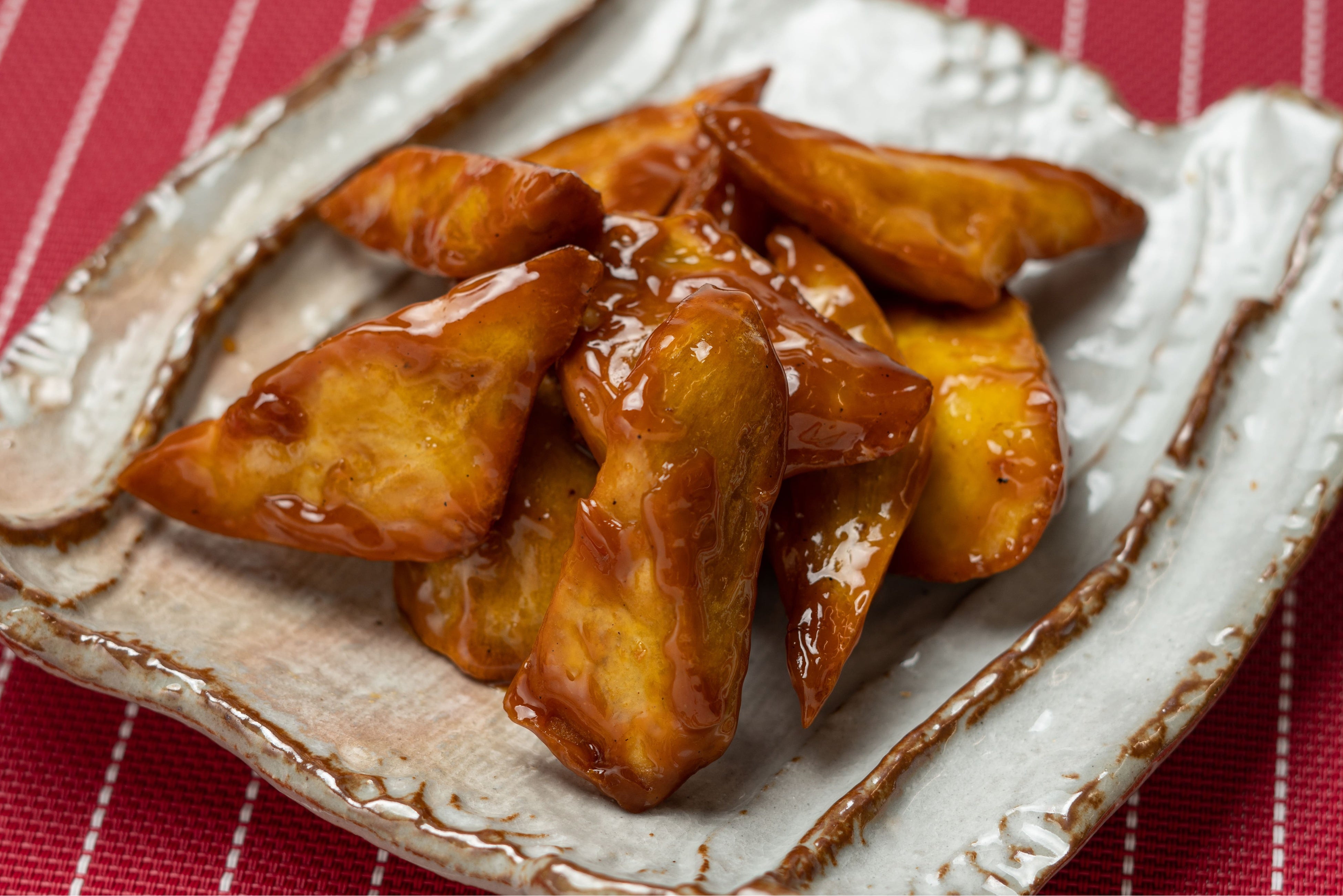水飴を和えるだけではなく、中華鍋を振りキビ砂糖と菜種油でアメから手作りしています。そこに2度揚げしたさつま芋を入れ仕上げているので、外はカリッと中はホクホクの本格的な大学芋が、ご家庭で楽しめます。