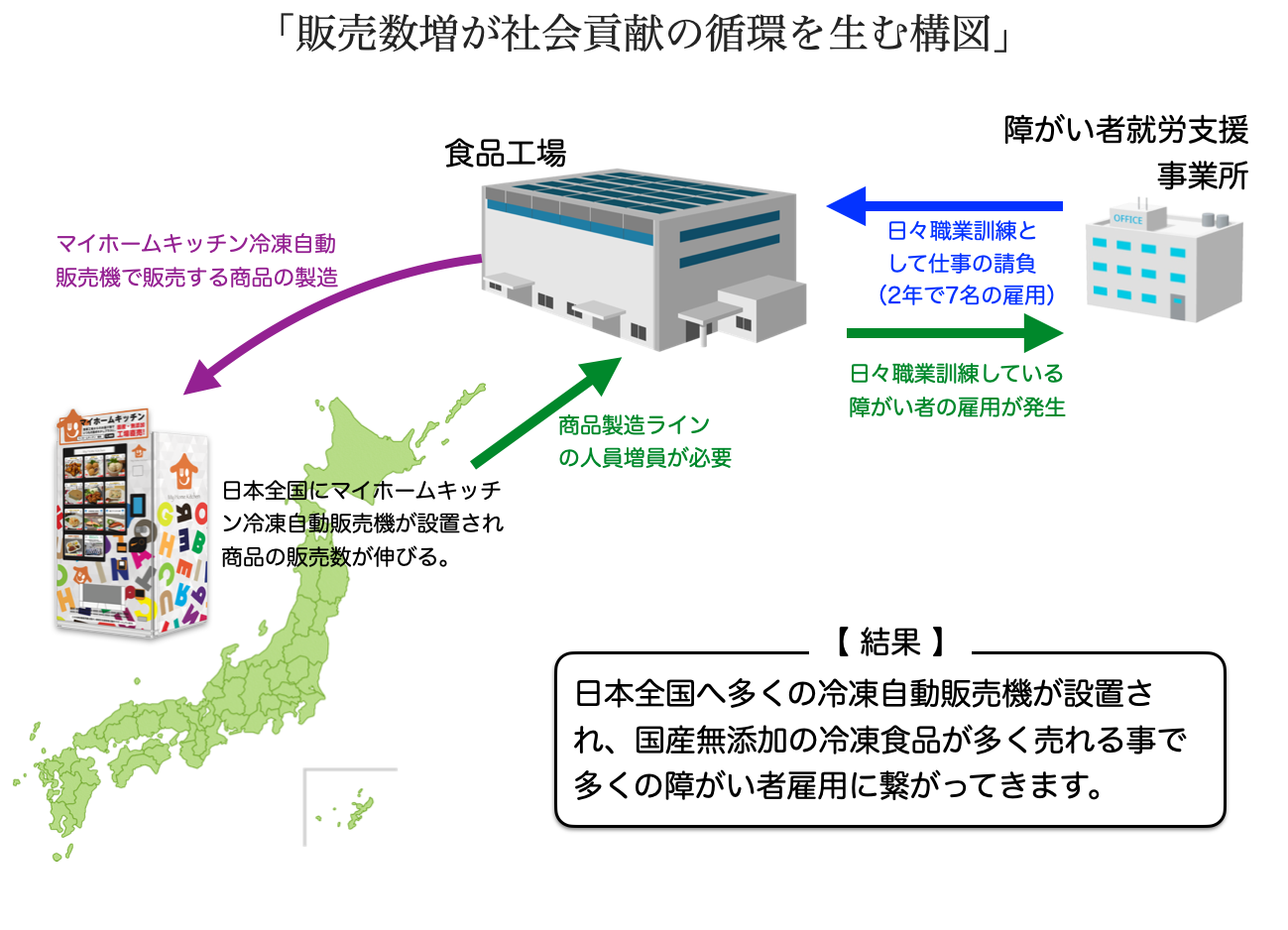 様々な考え方の人がいる、個々の性格や見た目の特徴も違う。おいしい冷凍食品を提供することが、そんな様々な人のほっとする時間や働くやりがい、ひいては豊かな地球を守ることにつながる。マイホームキッチンの冷凍自動販売機を広げることで、多様な人や環境が共存していくきっかけを作っていきたいと考えています。