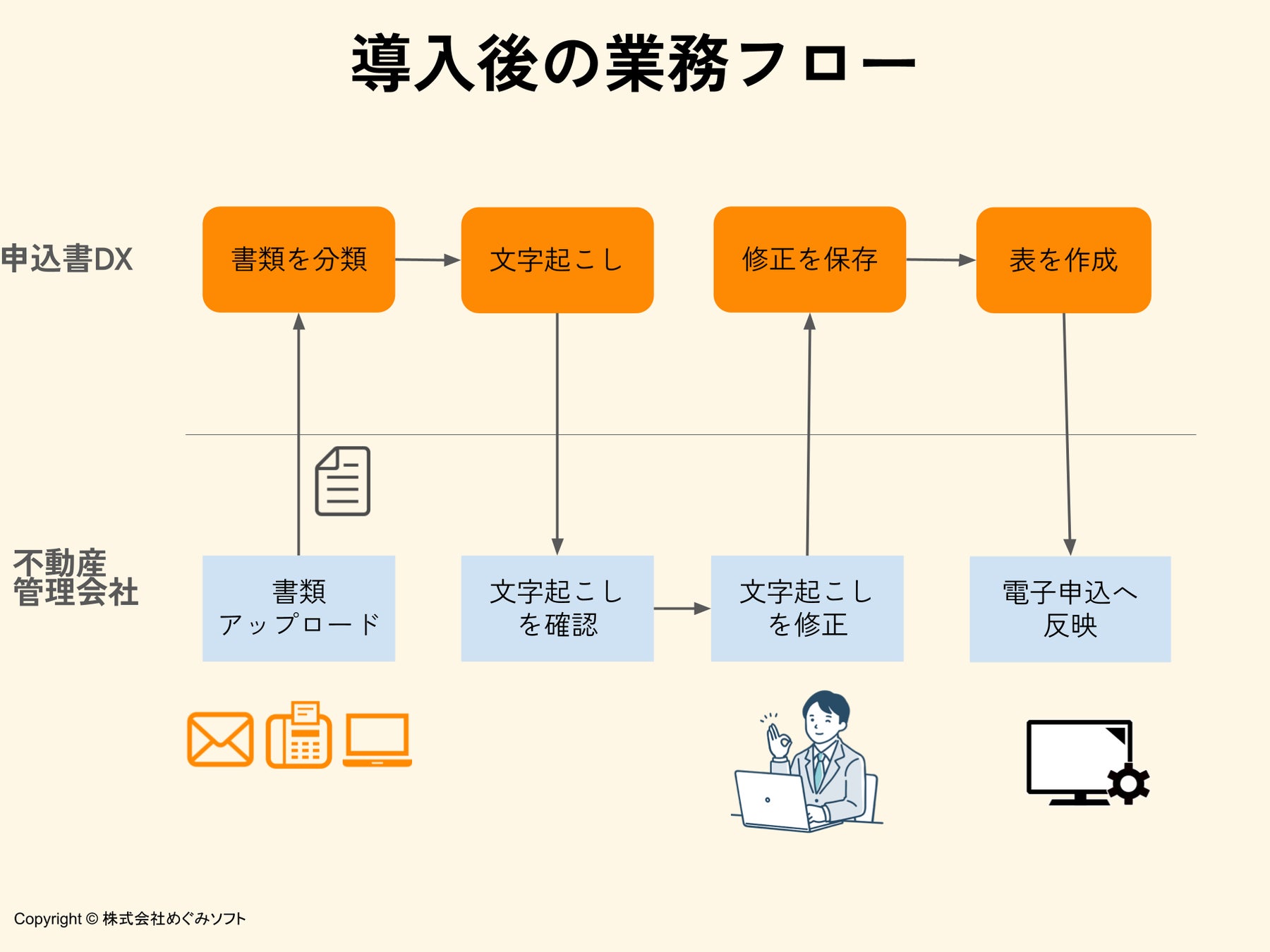 株式会社めぐみソフト(本社:東京都港区、代表取締役:中庄谷 栄太郎)は、入居申込書をはじめとしたあらゆる形式の書類のPC入力作業を半自動化できるWebサービス『申込書DX』のAPIを正式に提供開始しました。業務システムと『申込書DX』APIを連携することで、業務システムにアップロードされた書類を自動文字認識し、業務システムへ正しく自動入力することができるようになります。