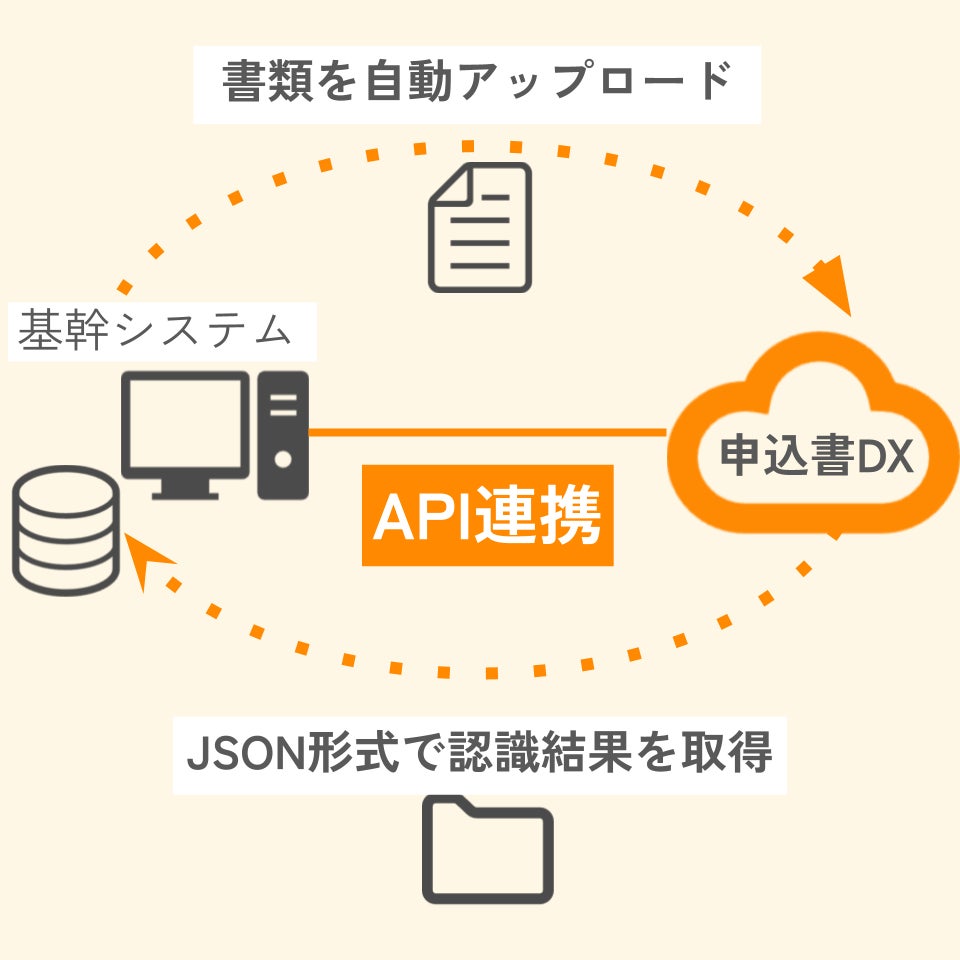 これまでは、業務システムと『申込書DX』の両方にログインし、業務システムからダウンロードした書類を『申込書DX』へアップロードし、文字認識結果のエクセルファイルを業務システムへ再度アップロードする必要がありました。今回提供を開始するJSON APIでは、『申込書DX』とシステムの間で自動連携できるようなります。それにより、書類やファイルのアップロード・ダウンロードが全て自動化され、業務フローを簡素化できます。