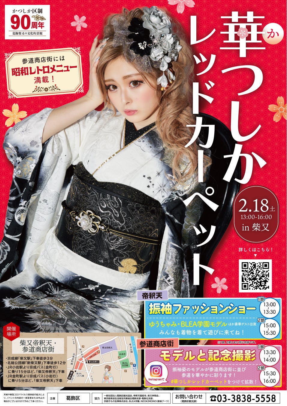 葛飾区が主催となり柴又帝釈天境内及び参道商店街内(〒125-0052 東京都葛飾区柴又7−10)にて、京都きもの友禅とBLEA学園が共同開発した振袖を生徒及び、egg専属モデル・タレントのゆうちゃみが振袖姿でランウェイする『華つしかレッドカーペット』が開催されます。(入場無料)