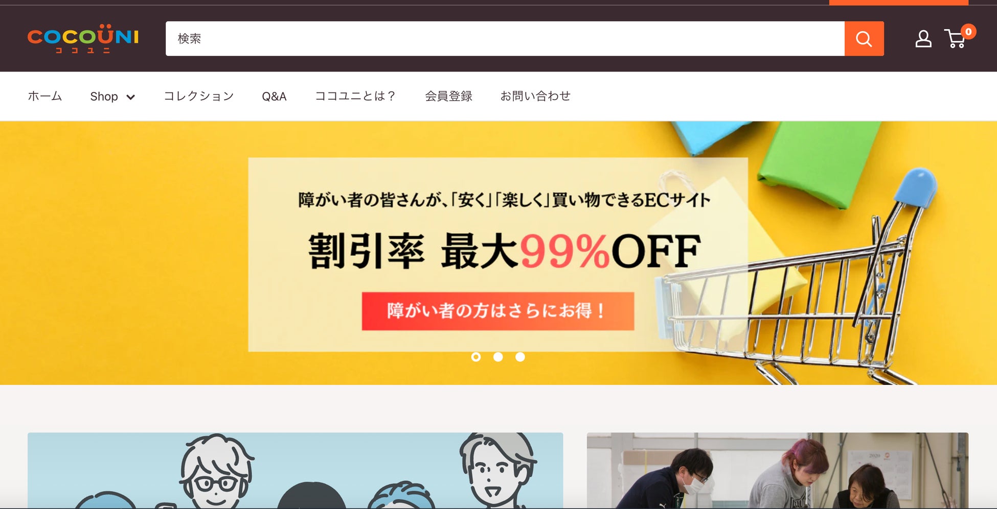 「ココユニ」では、会員登録することでの割引制度も導入しており、障がい者の方であれば商品ジャンルによって最大99%OFFで購入することも可能です。また、障がい者を支援する方々(ご家族、施設スタッフ)も割引適用制度を用意しています。コンセプトに賛同いただき、商品提供などご協力いただける企業様も募集しています。