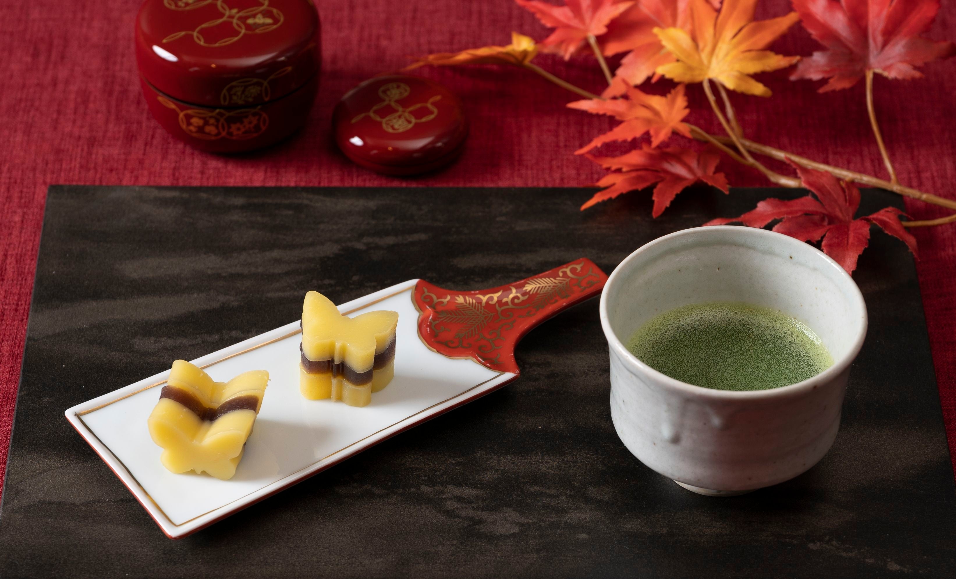 流行りのあんバターサンドならぬ羊羹のコンテサンドに、香り高く色鮮やかで旨味の濃い抹茶を合わせました。サンドに使用したのはバターのようなミルキーな風味やクリーミー感が残る若い熟成のコンテで、甘い小豆の風味と非常に相性が良く、甘味と渋みのバランスが取れた抹茶と最後のデザートとしてお薦めのペアリング。さらに抹茶にはビタミンCが含まれているため、ほぼ完全栄養食品と呼ばれているチーズに足りない栄養素を補う意味でも理にかなった組み合わせです。