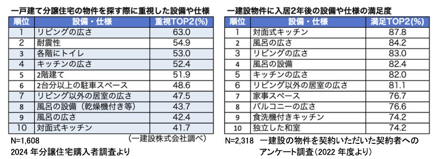 2024年分譲戸建住宅購入者調査によると、一戸建て分譲住宅の物件を探す際に重視した設備や仕様として、「リビングやキッチンの広さ」や「風呂の設備(機能)」など、住み心地に影響する項目が多くあげられています。
