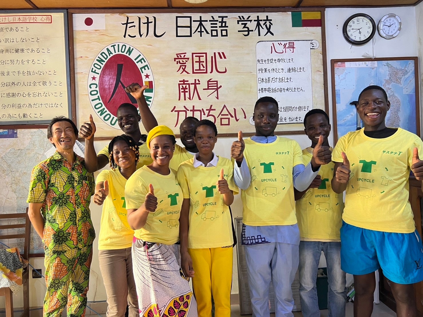 西アフリカ ベナン共和国で日本のアップサイクル事例を紹介!たけし日本語学校に病院の白衣から作られたサステナTをお届け