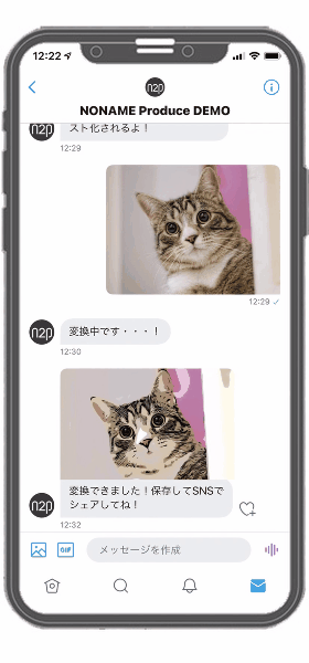 ユーザーがテキストや写真や動画を送信すると、あらかじめ決められた画像や動画と合成したり、フィルターを掛けた画像や動画を生成できるコンテンツです。