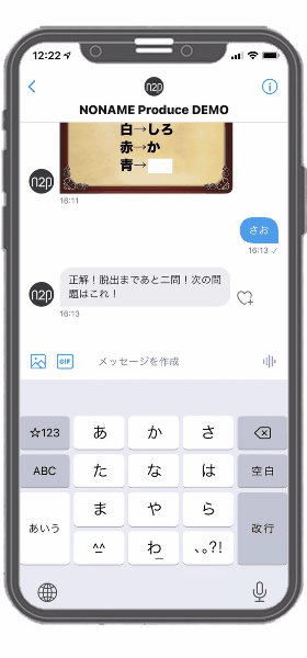クイズを出題して回答してもらい、正解・不正解などそれに対する回答を返信する。それを複数回行いながら謎を解いていくコンテンツです。クイズや謎などに商品の強みを入れることで商品訴求に貢献できるのが特徴です。シミュレーションゲームや脱出ゲーム形式にして、更にそこにストーリーを入れていくと効果大です。