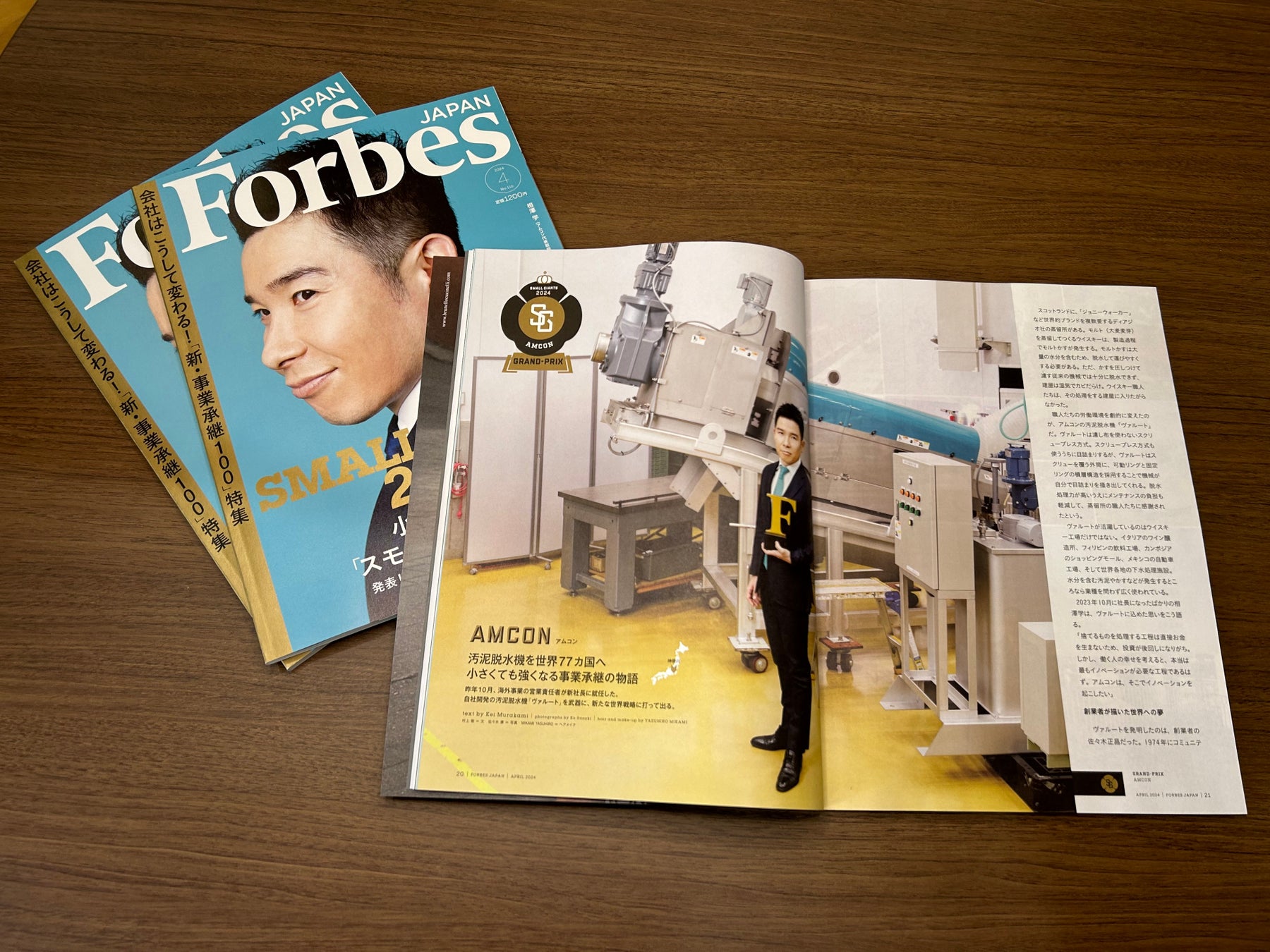 汚泥脱水機「ヴァルート™(多重板型スクリュープレス)」を開発し、世界の汚泥脱水機市場に新しいジャンルを創出したアムコン株式会社(本社:神奈川県横浜市、代表取締役社長:相澤学)は、2023年11月に開催された「Forbes JAPAN SMALL GIANTS AWARD 2023-2024」において、ニッポンが誇る「小さな大企業」として栄えあるグランプリを受賞。グルーバル経済誌「Forbes JAPAN」4月号(発行元:リンクタイズ、発売日:2024年2月24日、定価:税込1200円)の表紙を飾り、特集記事が掲載されました。