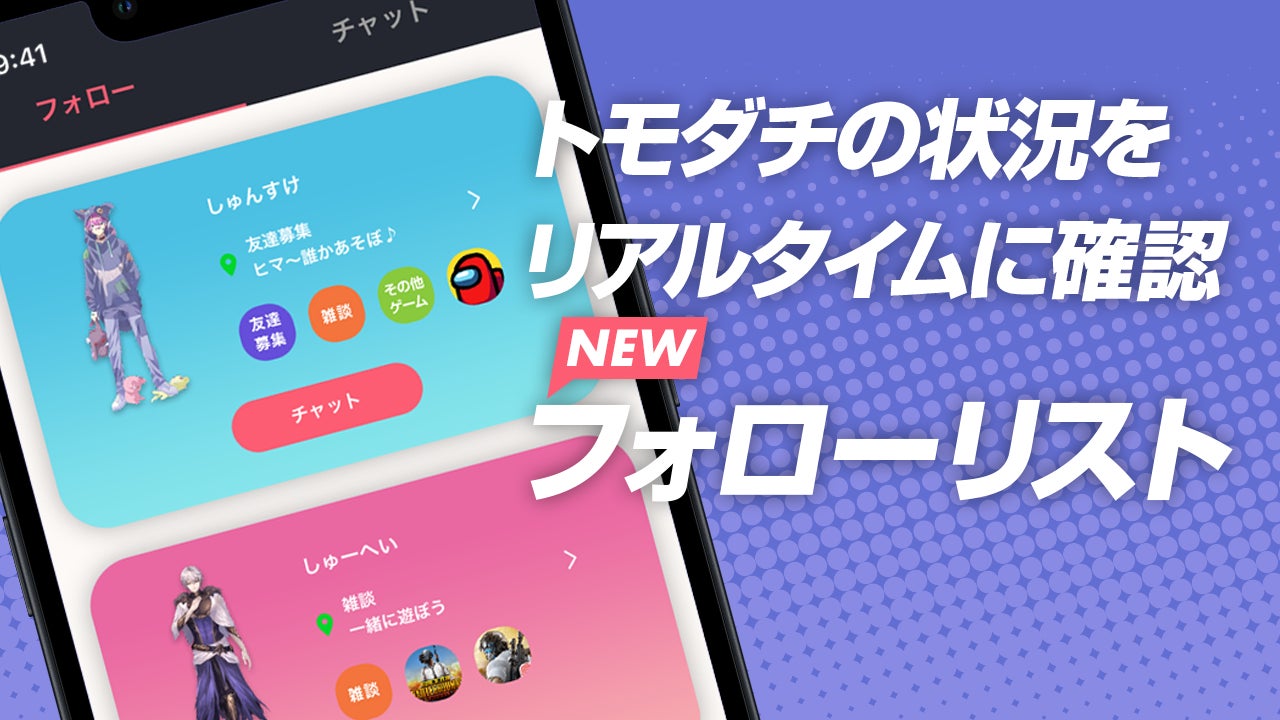 フォローリストをよりスタイリッシュにアップデートしました。デザインの大幅変更に加えて、トモダチのログイン状況や、現在遊んでいるルームの確認が可能になりました。