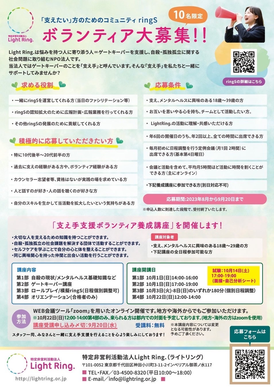 そこで、Light Ring.では、この期間を「子ども若者ゲートキーパー支援強化週間」とし、①オープンチャット参加者を増やすために、この度初の試みとなるインスタライブを行います。また、②Light Ring.の活動に賛同し、協力してくれるボランティアの方を募集いたします。