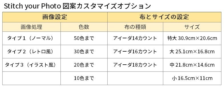生成されるクロスステッチ図案は色調や色の数、刺したい布の大きさや目の細かさまでお好みでカスタマイズすることができます。