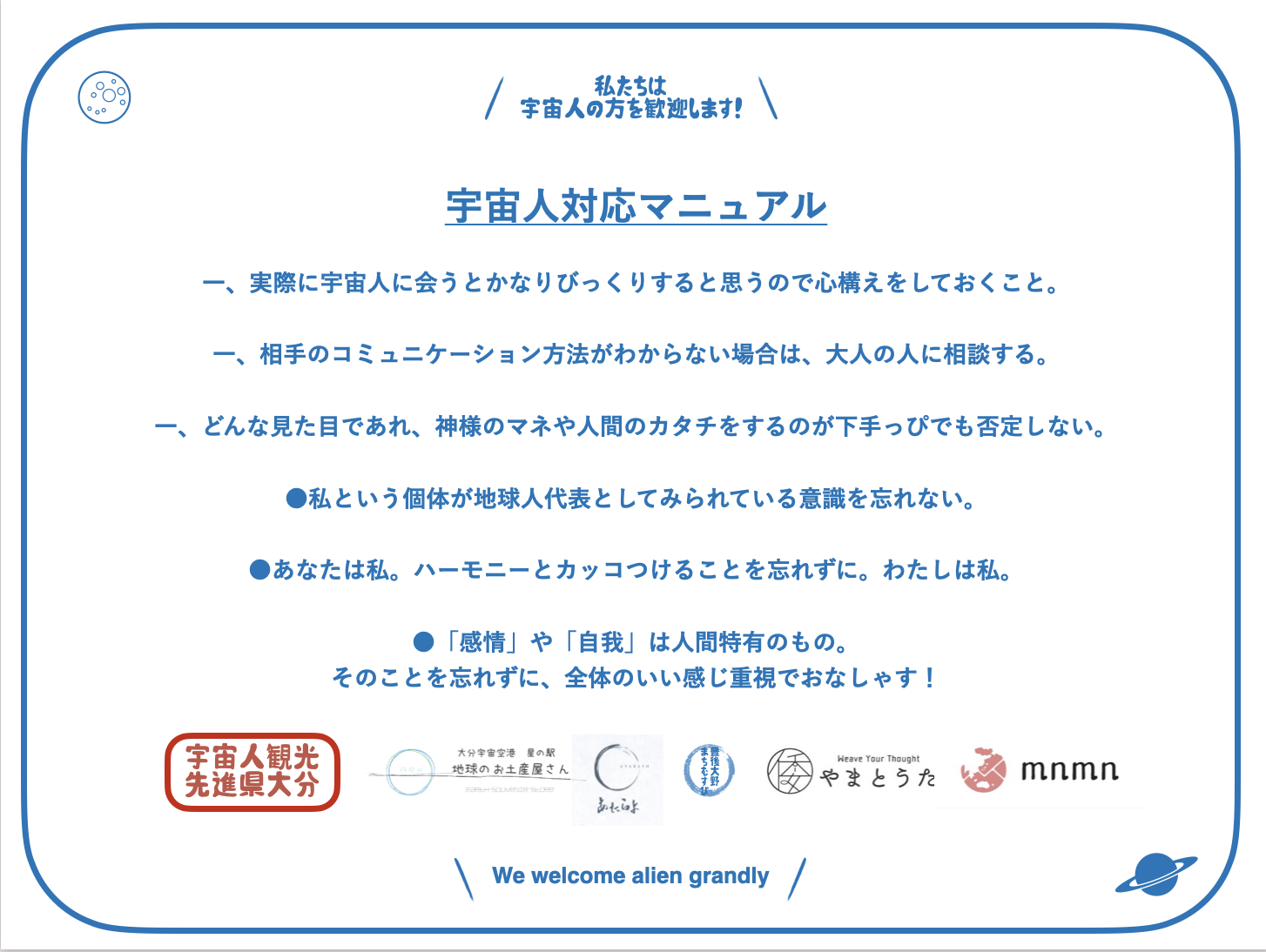 この勢いのまま加盟店を増やし来年4月までに300店舗を目指します。そして宇宙人パスポートや地球ビザの発行を行い、宇宙人観光客の方が安心して地球に遊びに来られる街をつくります。また、来年3月には大分県民の2万人の署名を集め「UFO駐車禁止」や「地球人を連れ去ったらいけない」などの宇宙人向け条例を作れるよう、大分県に働きかけます。こうして大分県を宇宙人も受け入れる「真のダイバーシティの街」として街づくりを行うことが本委員会の目標です。