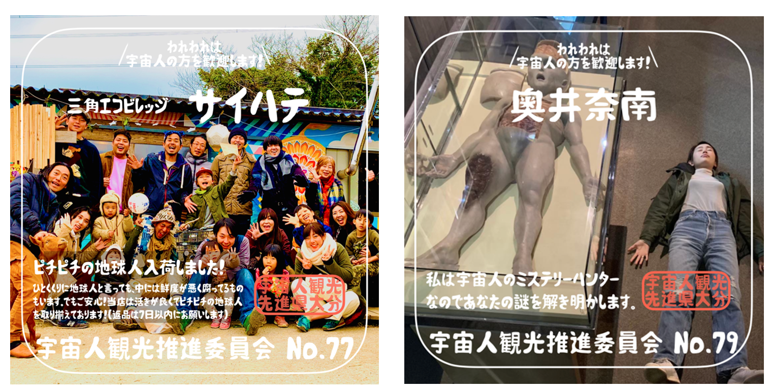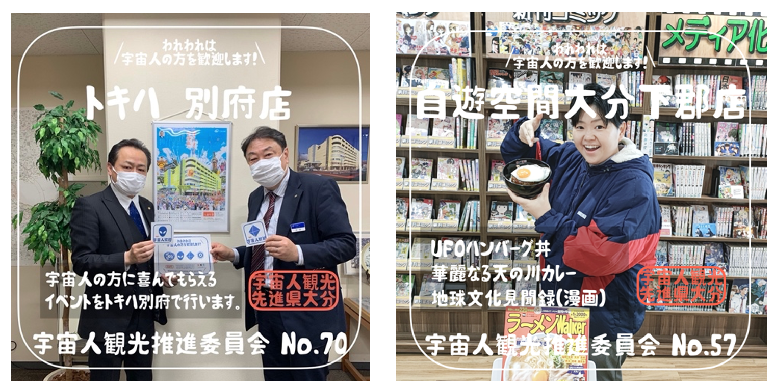宇宙人観光推進委員会は、大分県内にて宇宙人観光客を歓迎する店舗を本委員会の加盟店とし、加盟店の30店舗に「宇宙人歓迎」ステッカーを配布しました。加盟店は宇宙人観光客向けに商品を考案しており、12月1日に加盟店30店舗が同時に商品を発表しました。そして2021年12月28日現在、登録加盟店は100店舗となりました。