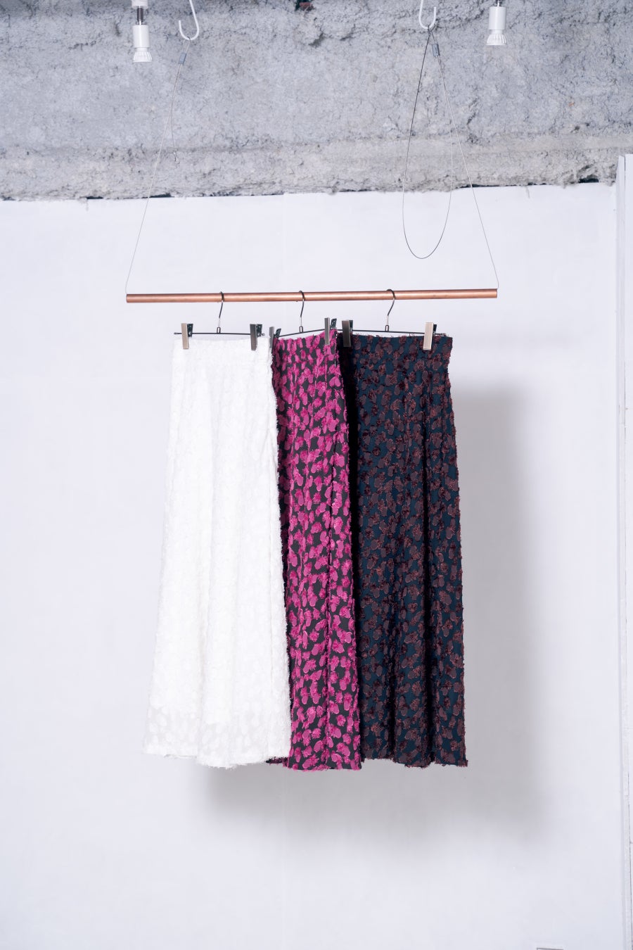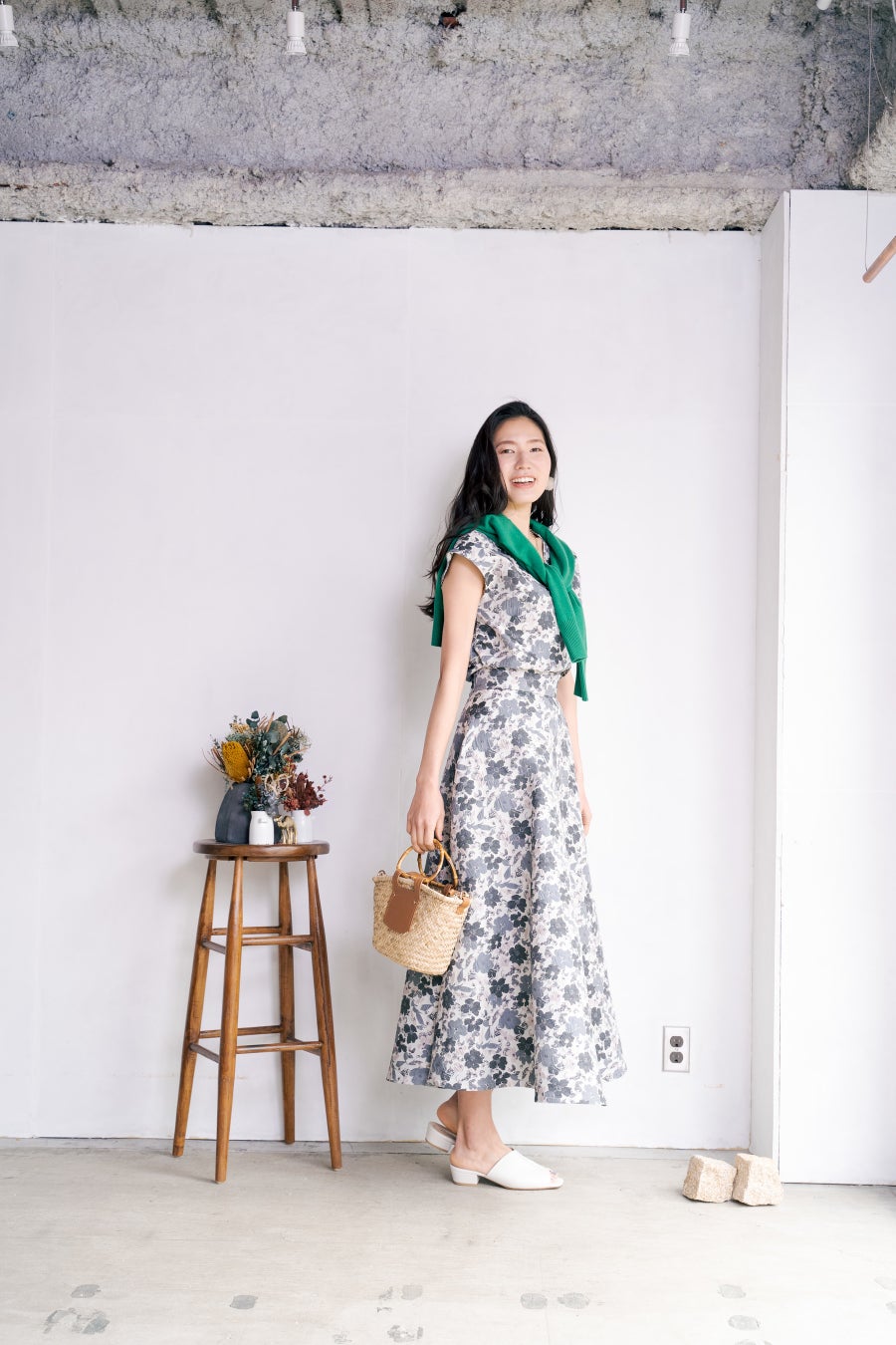 生地にハリ感があるため、ドラマティックに裾が広がりますが、色味が甘すぎないので上品な仕上がりに。