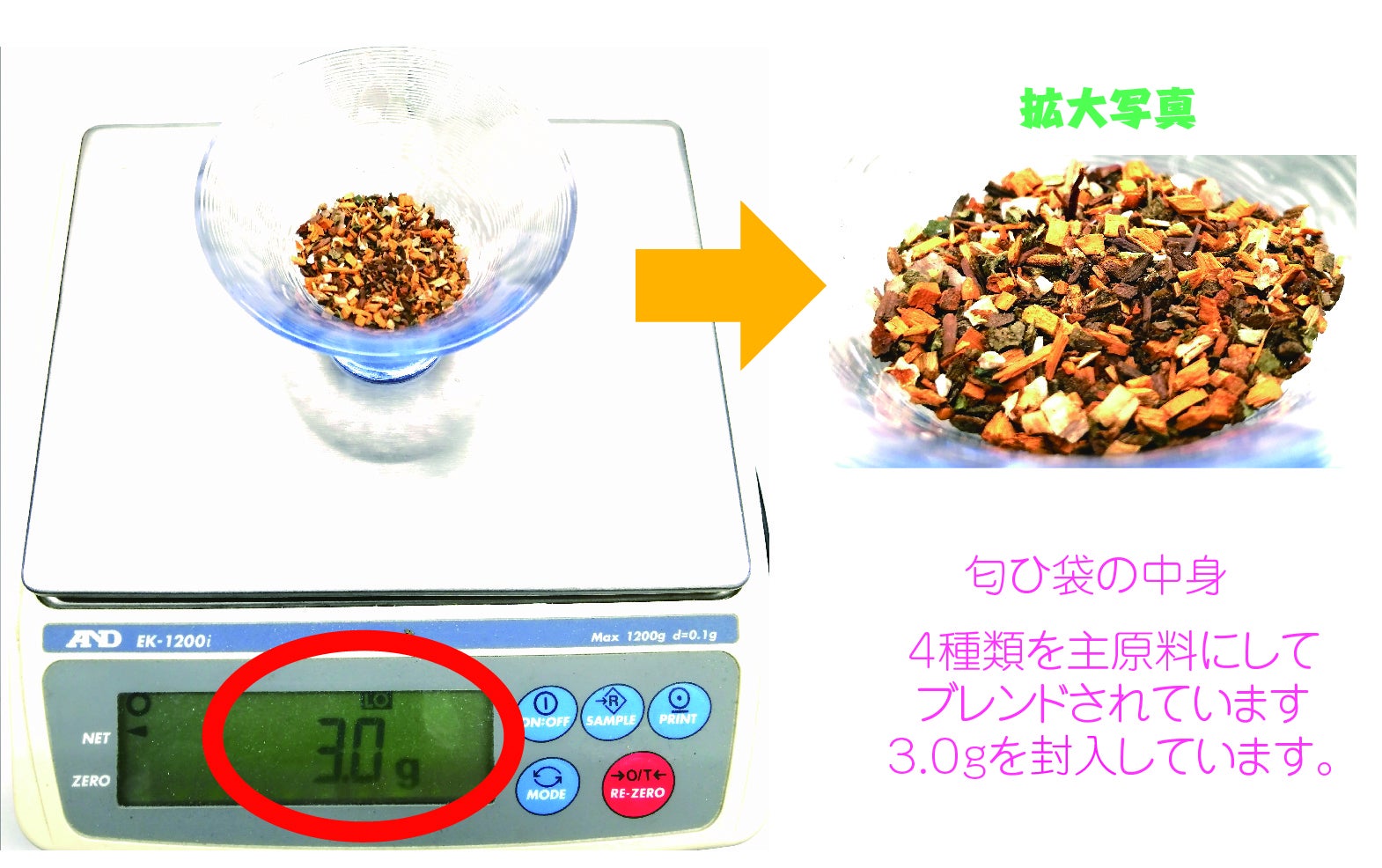 天然材料を細かく刻んで調製されております。匂い袋の香りになります。